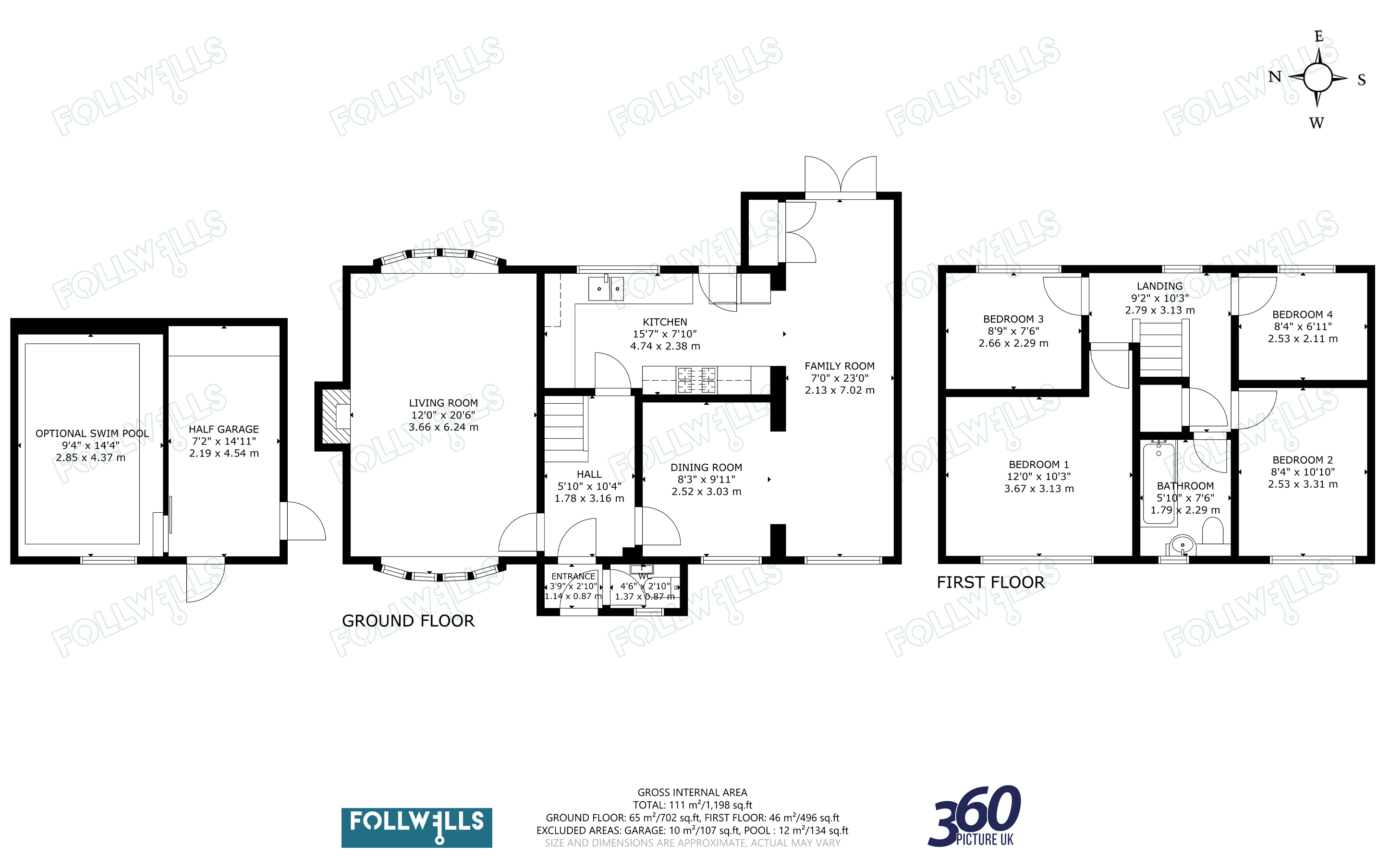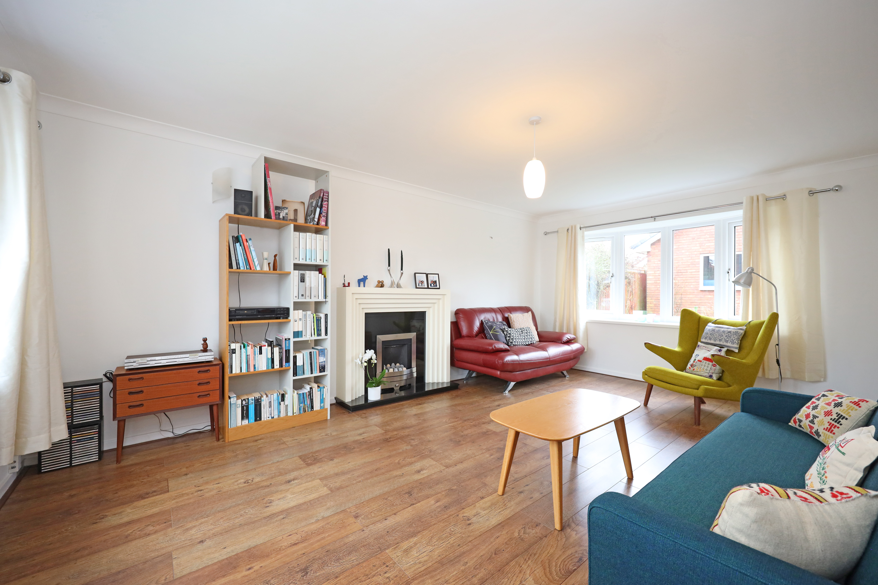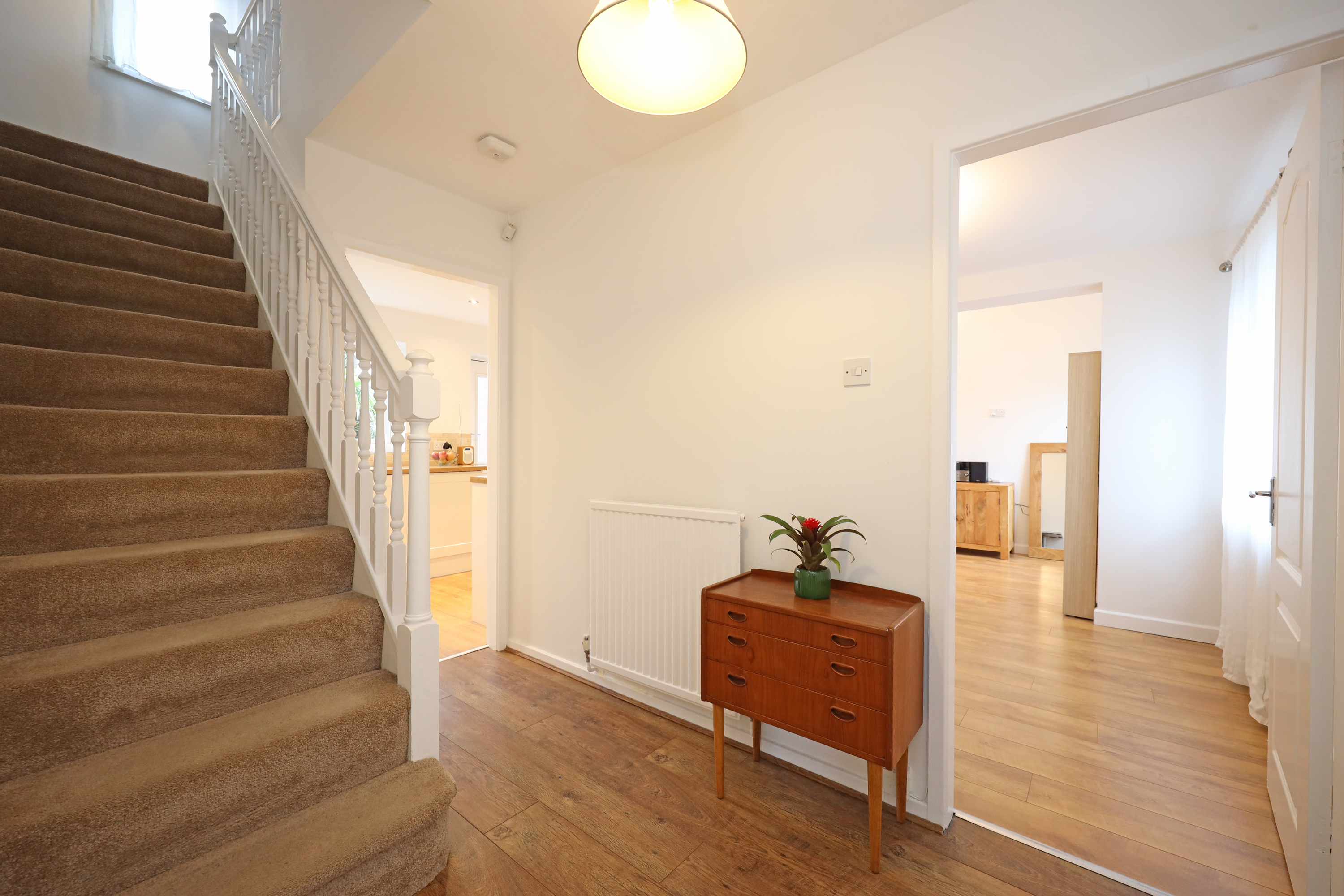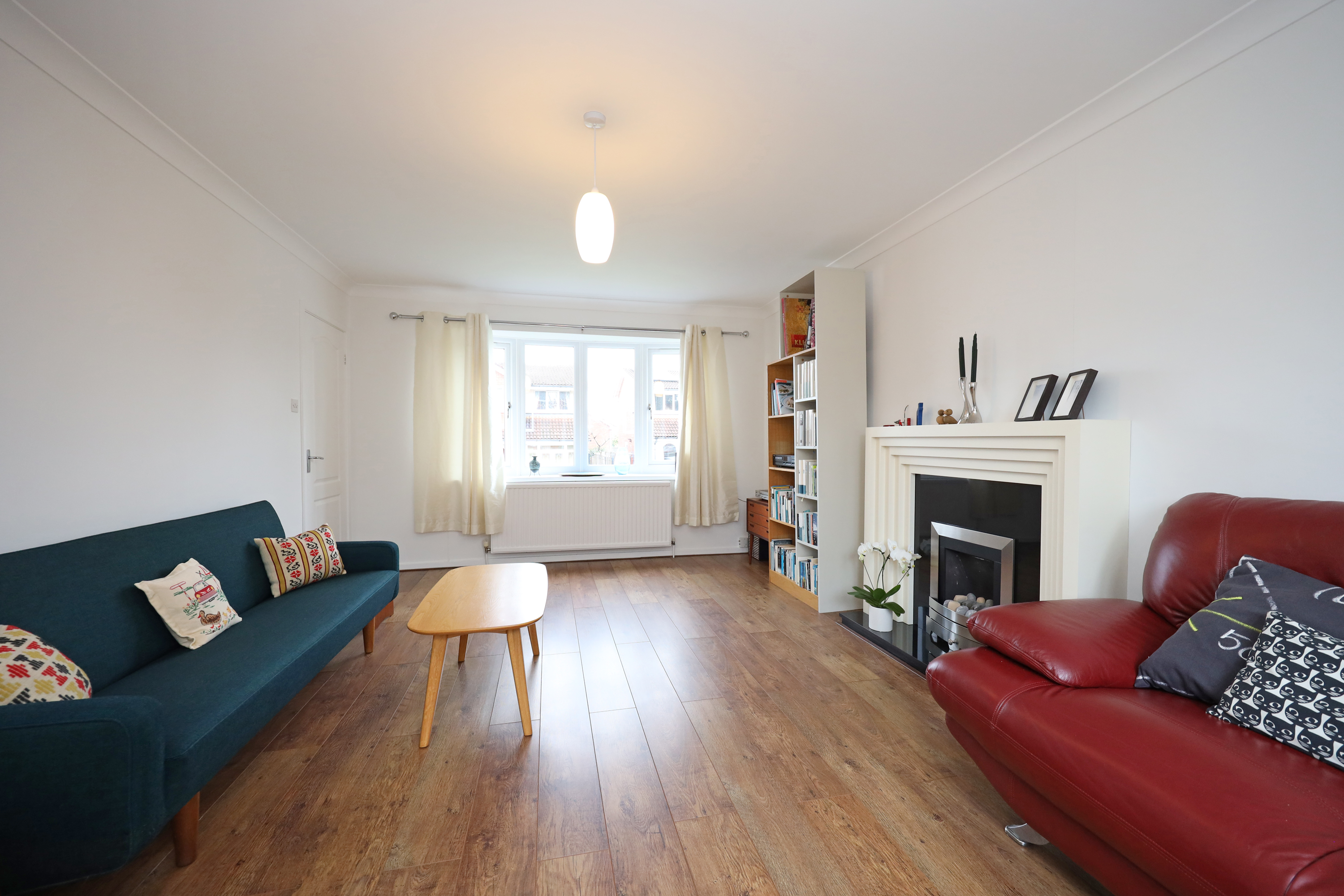Front entrance porch with replacement composite door and access to a cloaks/WC. Internal glazed door from the porch opens to a central reception hallway with staircase and hard flooring that runs through the ground floor. A large full width living room features a dual aspect front and rear bow window and features a contemporary fireplace.