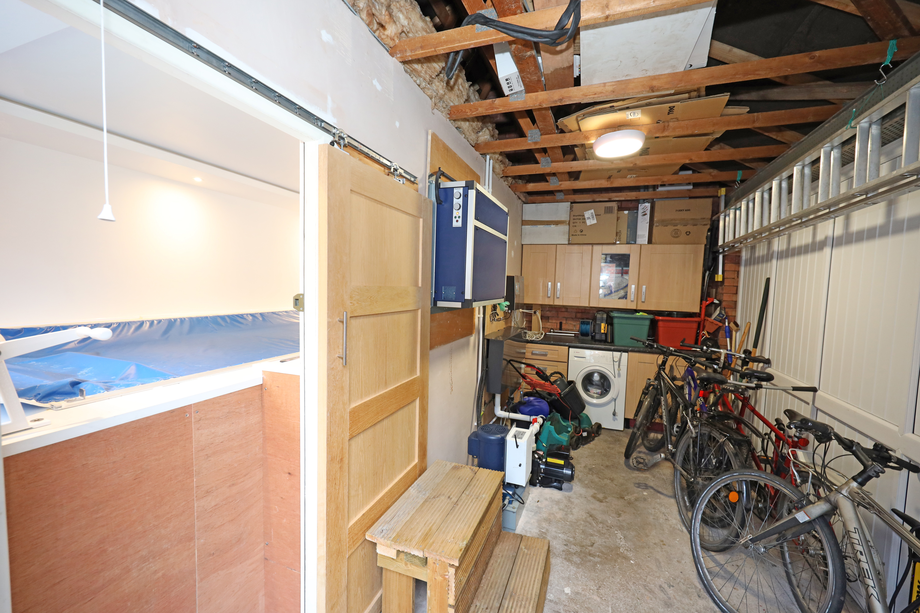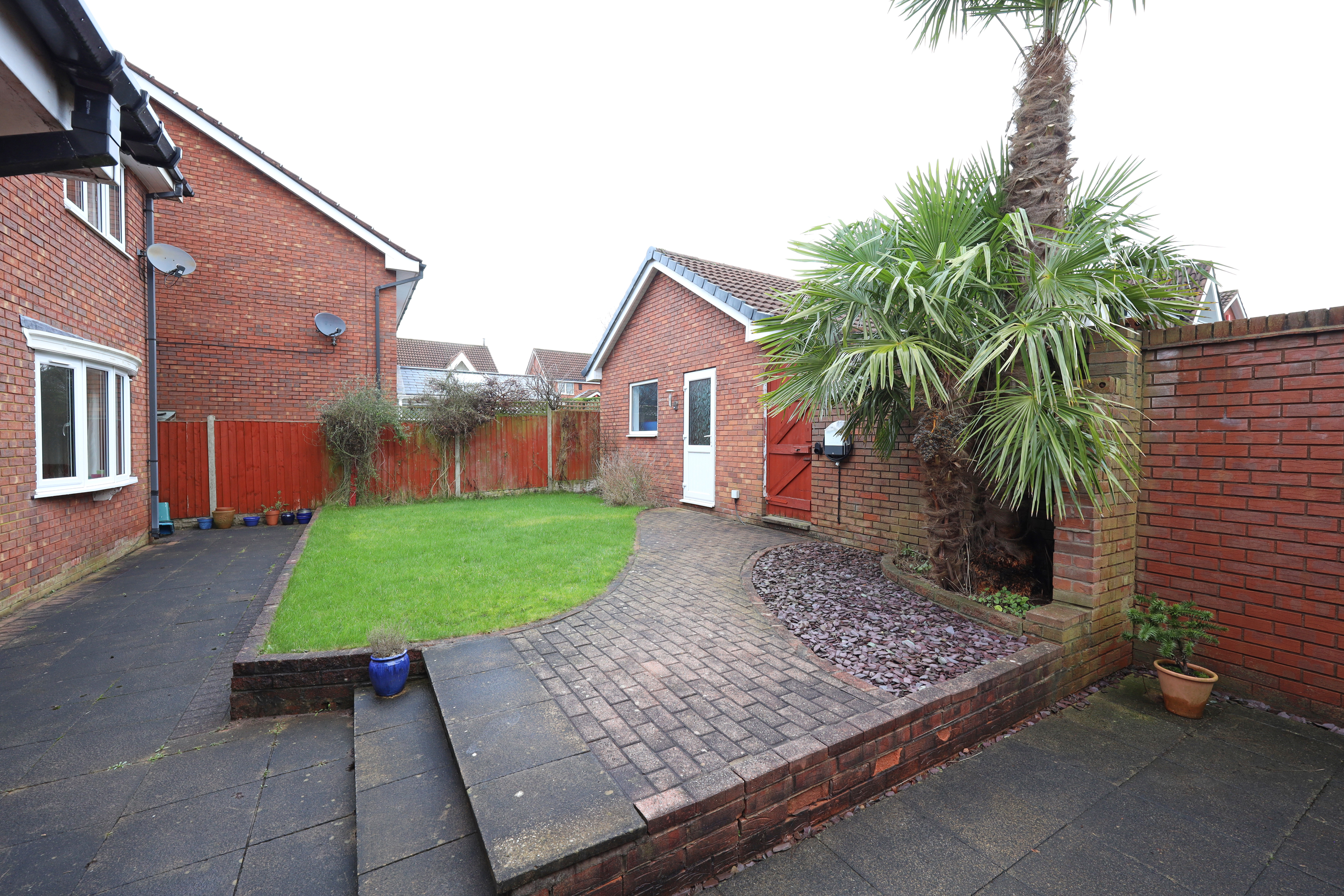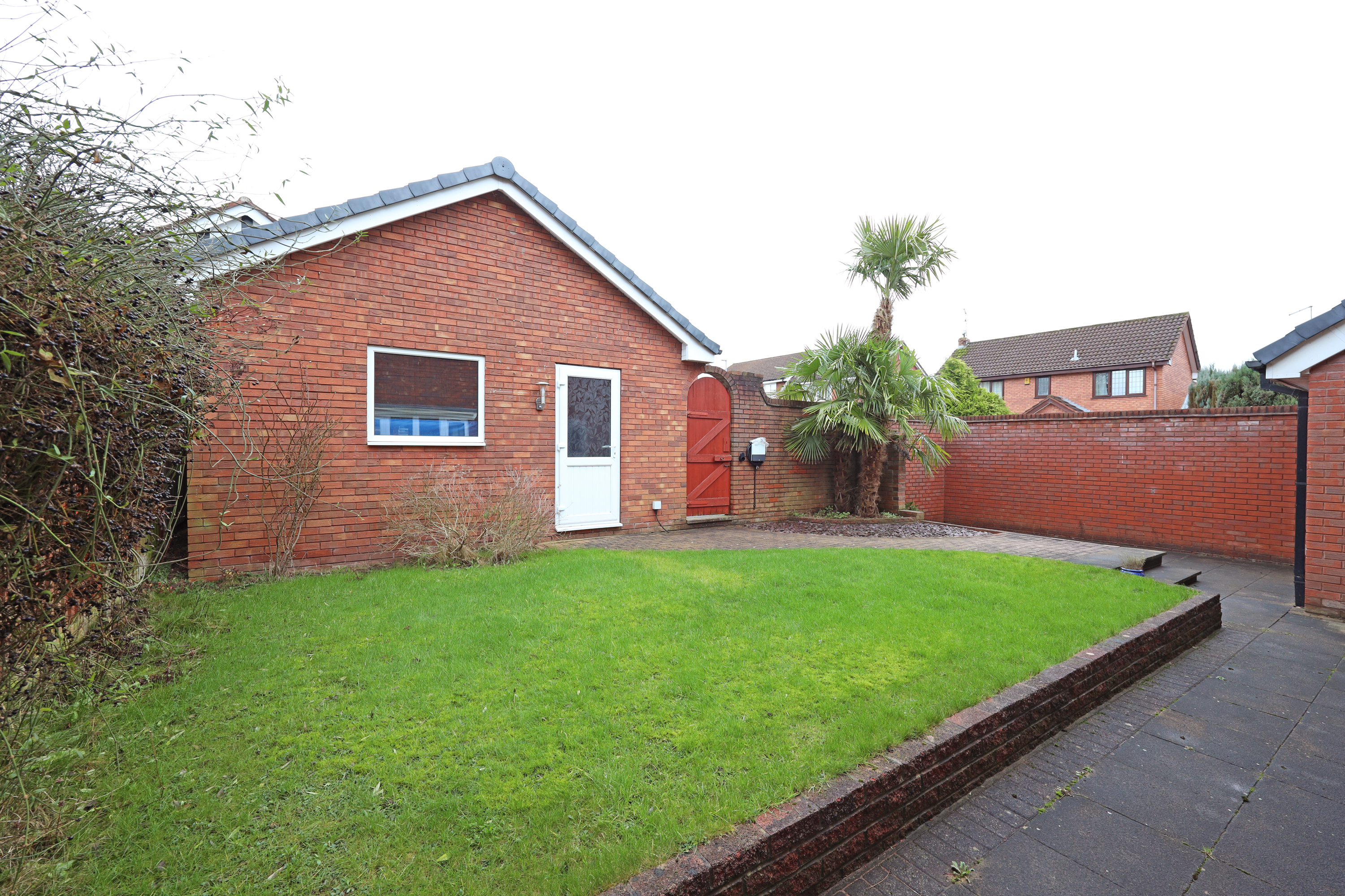 The property has an attractive corner plot position, with small lawn area and block paved pathway to the front door. To the rear is a privately enclosed garden with shaped lawn, paved patio areas and pathway to the garage and pedestrian gate giving direct access to a rear driveway which provides parking in front of a former double garage. The garage has currently been converted with UPVC screening and personal front access door with additional side access door from the rear garden. Internally the garage has been split into two areas comprising of a large useful storeroom with power connection, storage units and space for additional white goods. The rear half of the garage currently houses and exercise pool with wave machine. (Agents note: – The exercise pool is available and can remain in situ subject to separate negotiation. Alternatively, it can be removed by the vendor prior to completion of sale).