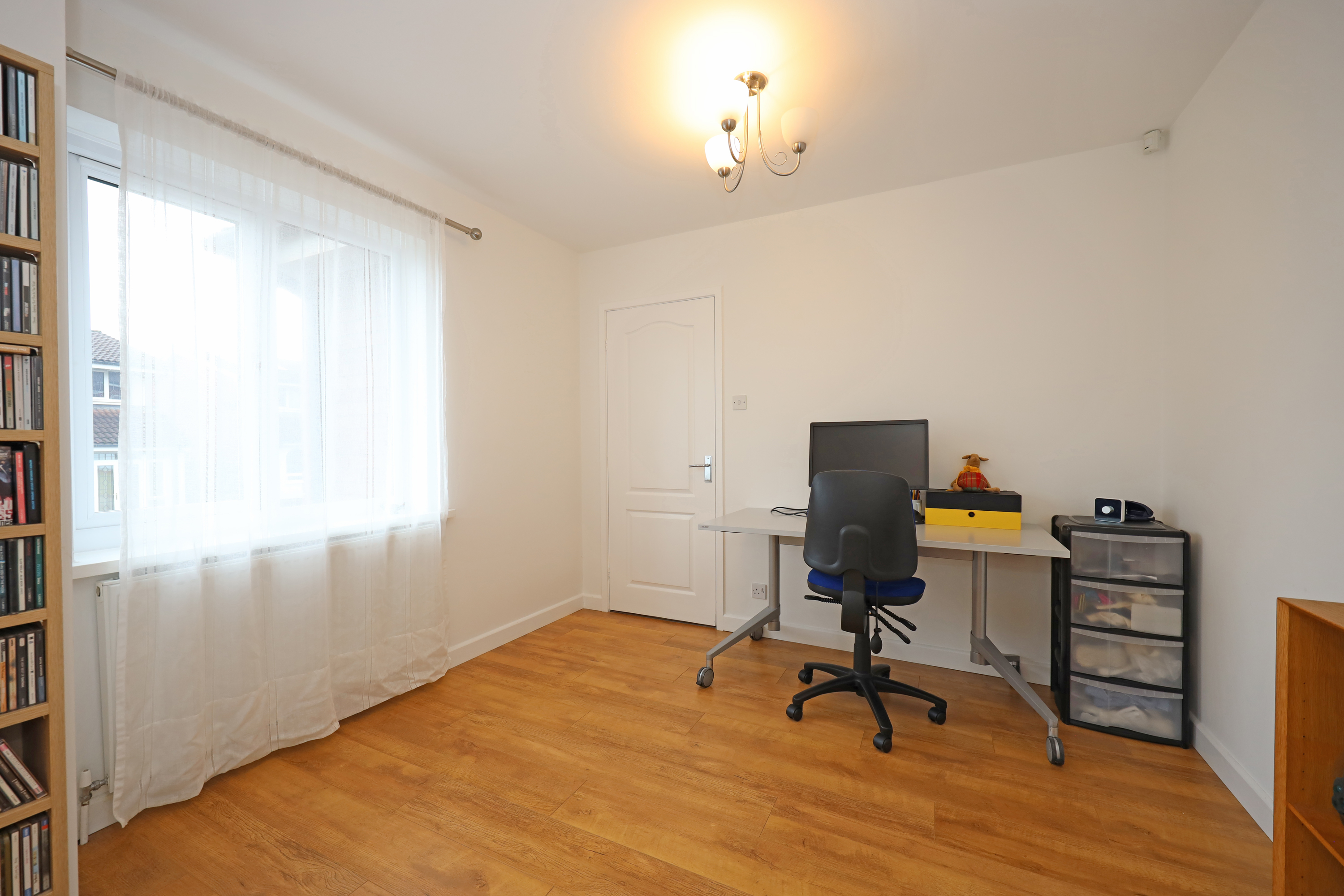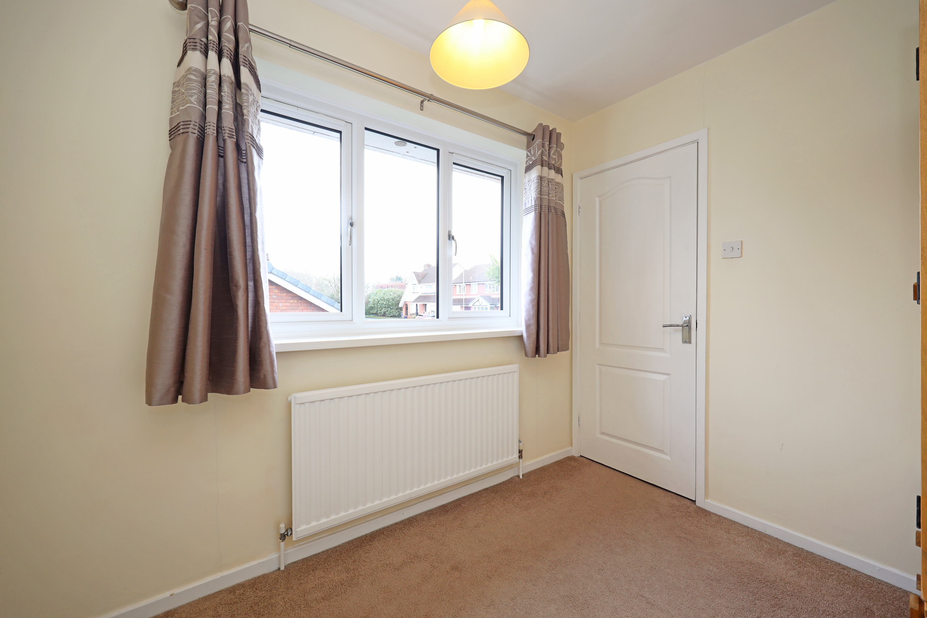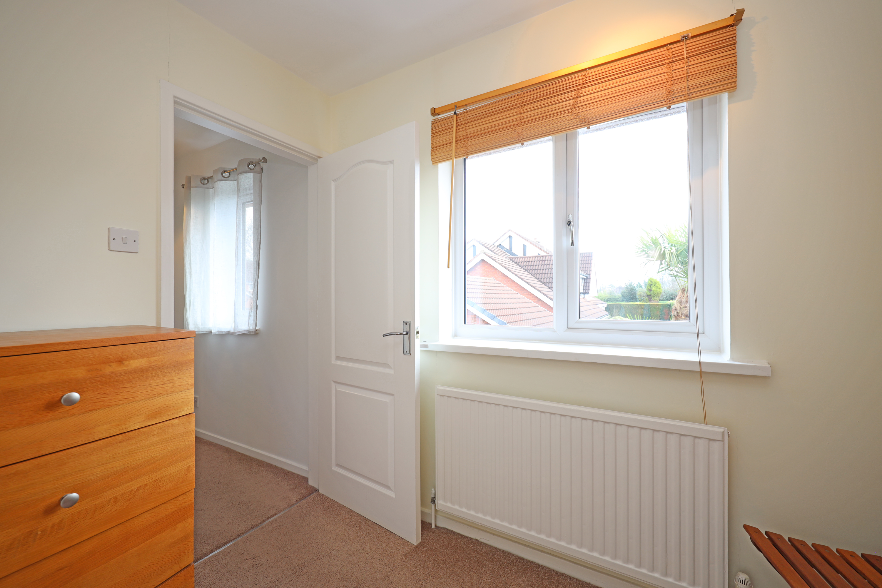 The property has an attractive corner plot position, with small lawn area and block paved pathway to the front door. To the rear is a privately enclosed garden with shaped lawn, paved patio areas and pathway to the garage and pedestrian gate giving direct access to a rear driveway which provides parking in front of a former double garage. The garage has currently been converted with UPVC screening and personal front access door with additional side access door from the rear garden. Internally the garage has been split into two areas comprising of a large useful storeroom with power connection, storage units and space for additional white goods. The rear half of the garage currently houses and exercise pool with wave machine. (Agents note: – The exercise pool is available and can remain in situ subject to separate negotiation. Alternatively, it can be removed by the vendor prior to completion of sale).