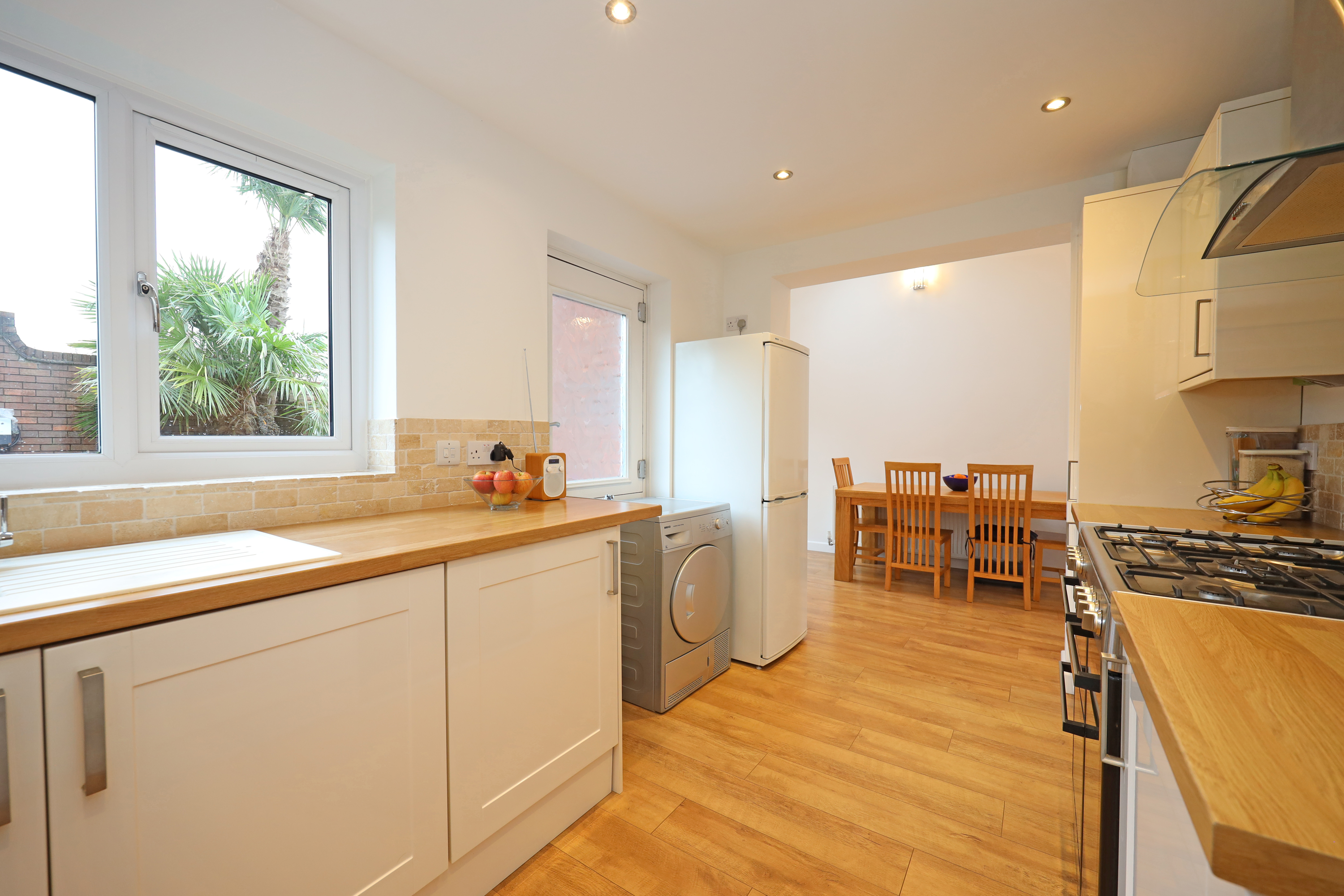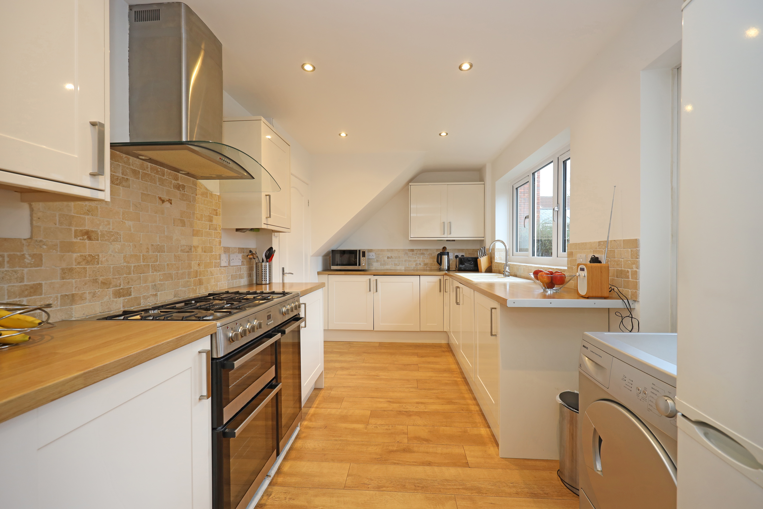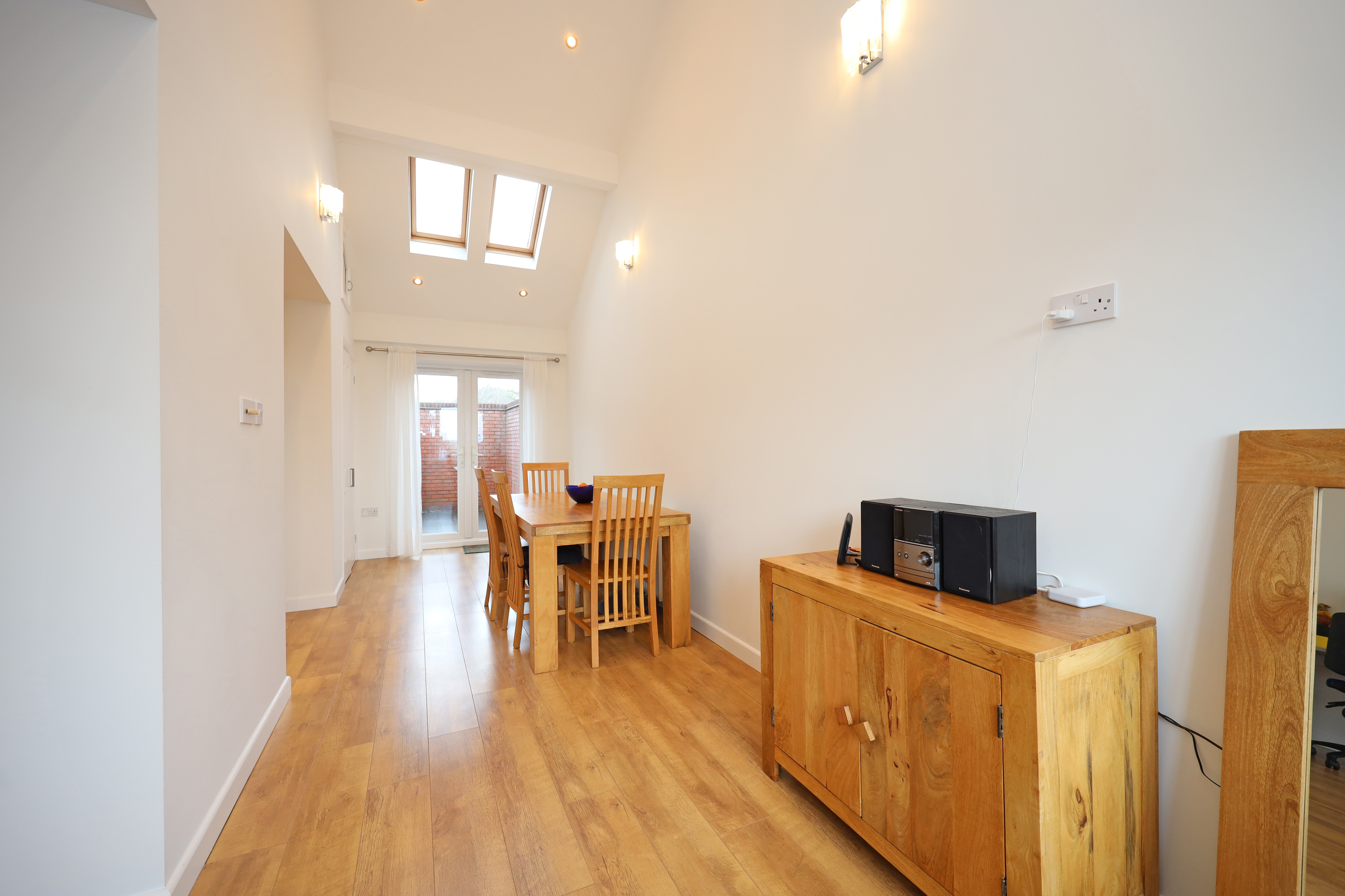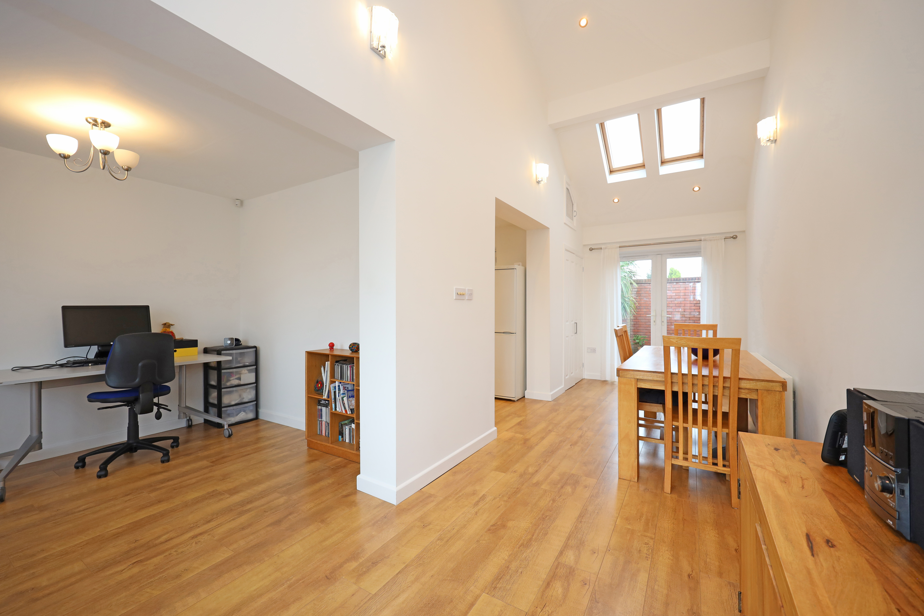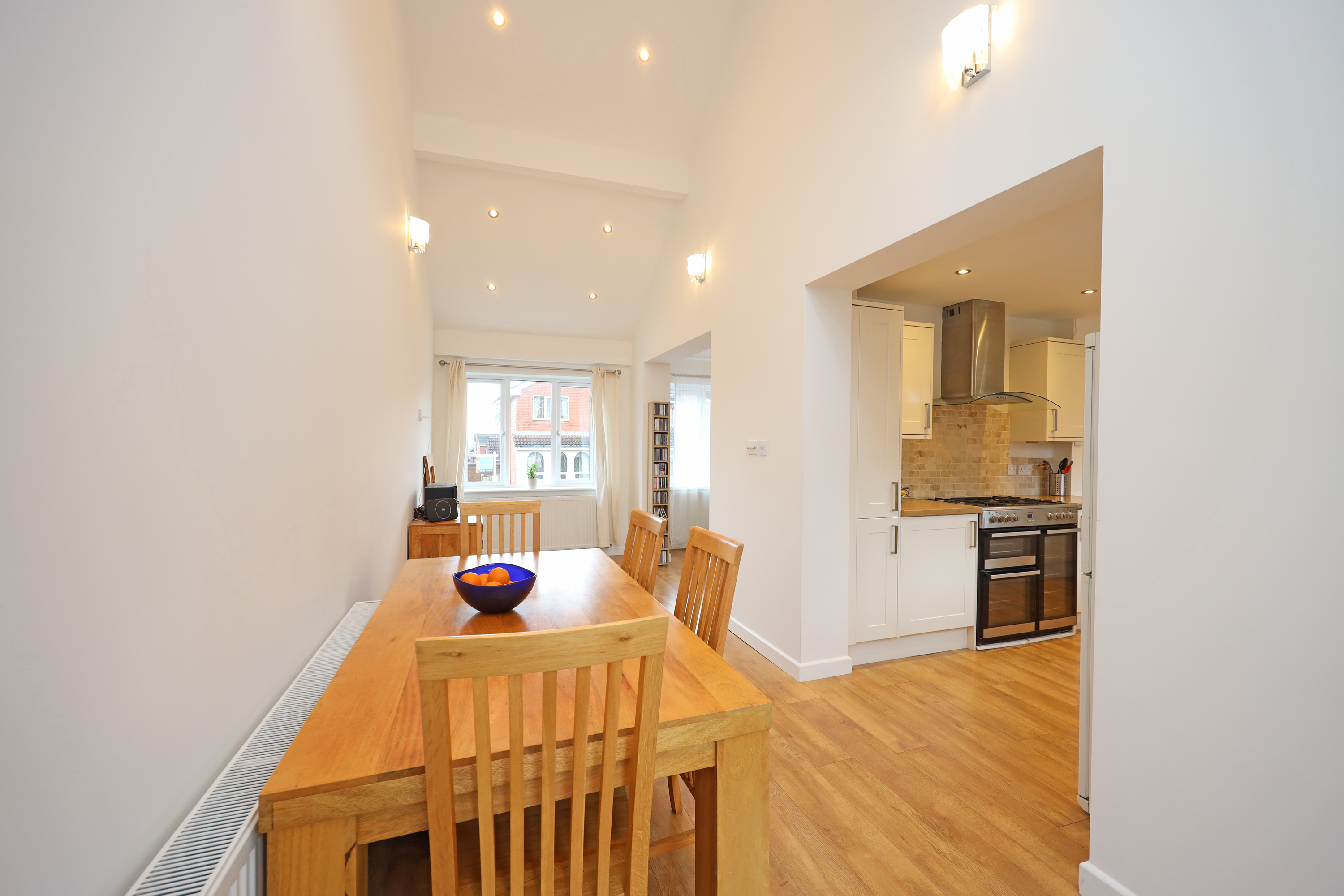 To the opposite side of the hallway is a family/dining area which has open access to a full depth family room with an impressive vaulted ceiling and twin skylights. There is a further window outlook to front and patio doors open to the rear garden. A double cupboard houses the central heating boiler and solar panel controls/battery. A further opening from the family room leads to the kitchen area which also has direct access from the hallway. The kitchen is fitted with a range of base/wall unit units with work surfaces and sink. Integrated appliances comprise fridge and washing machine. There is also a feature freestanding electric cooking range with five ring gas hob which will be included in the sale. A further window and separate door access and overlook the rear.