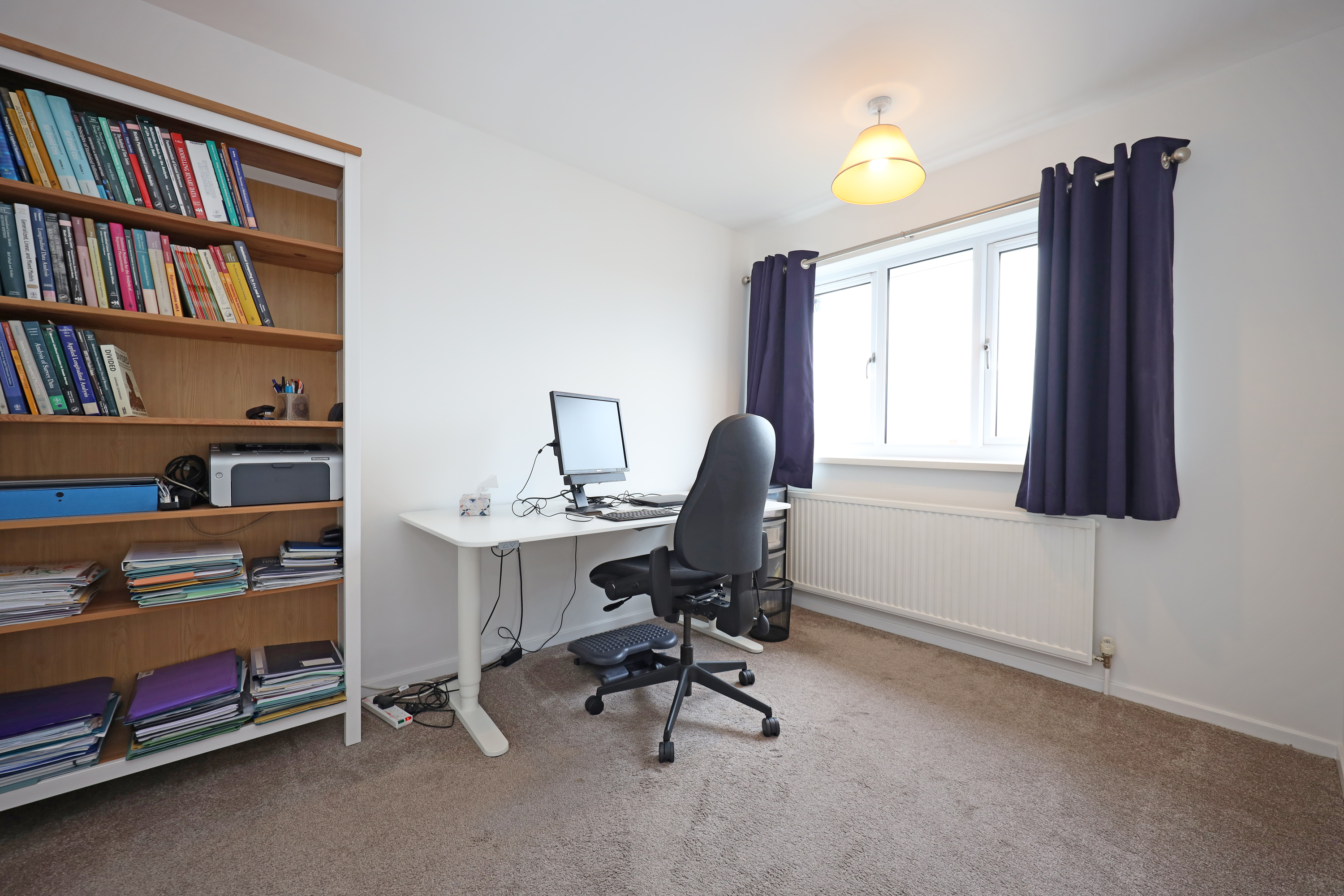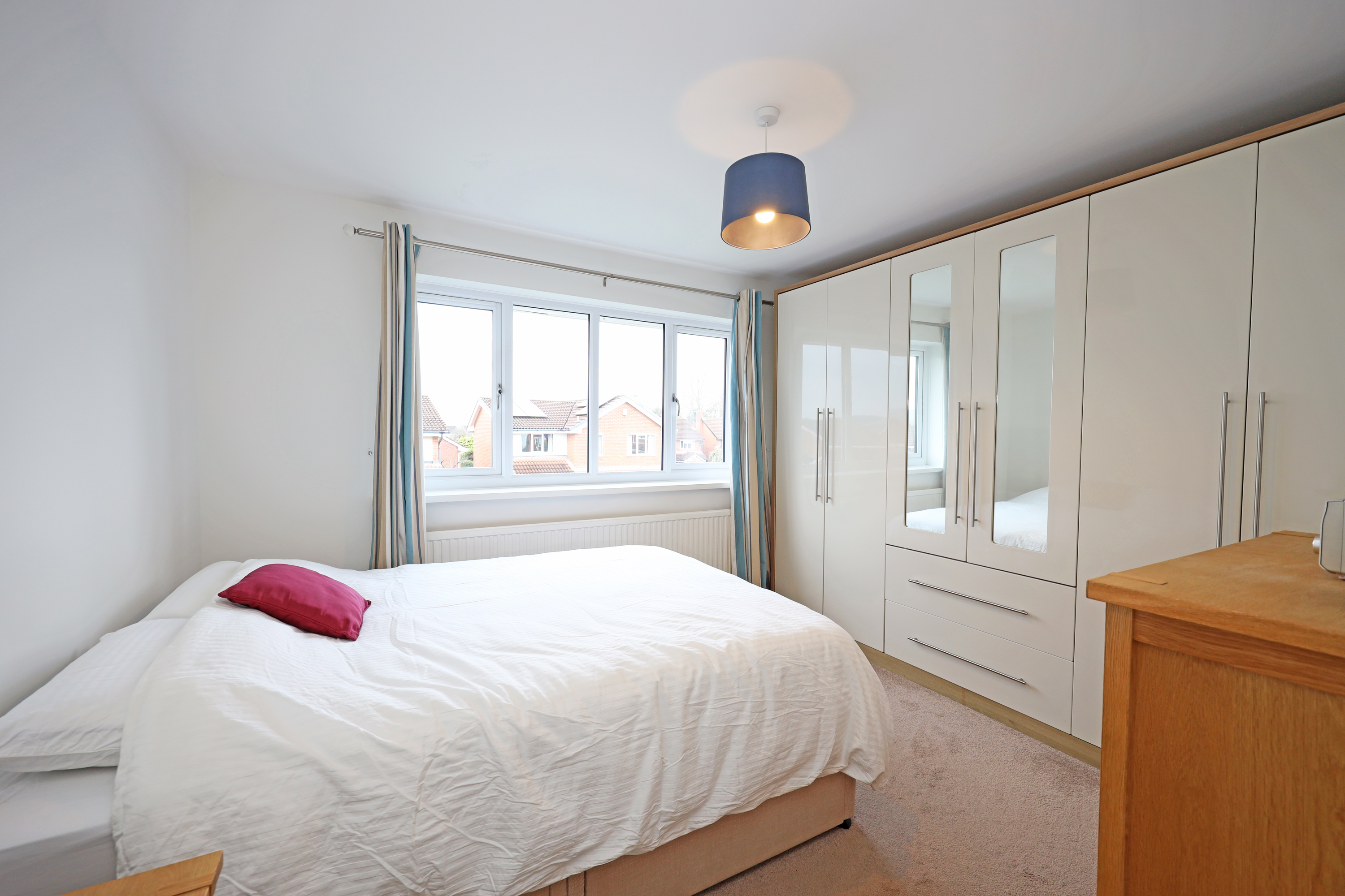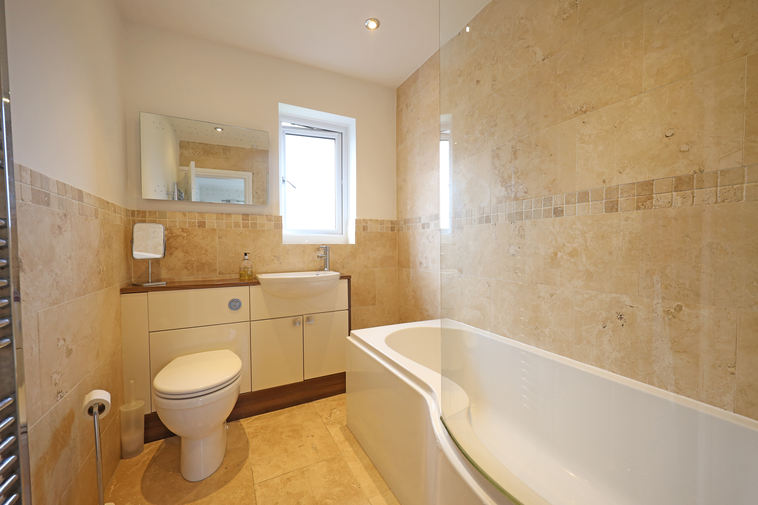 The first floor landing area has rear facing window, useful over stairs storage and loft hatch with pulldown ladder leading to a part boarded loft for additional storage. There are four practical sized family bedrooms, with the main bedroom enjoying partial far reaching views over rooftops. A family bathroom with travertine tiling is fitted with a P shaped bath having thermostatic shower and curved splash screen, combined WC and vanity wash basin.