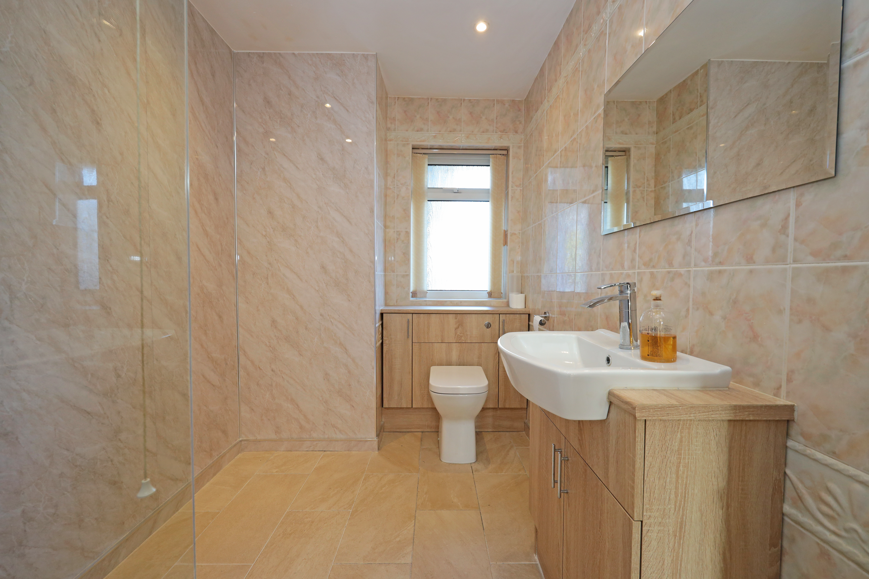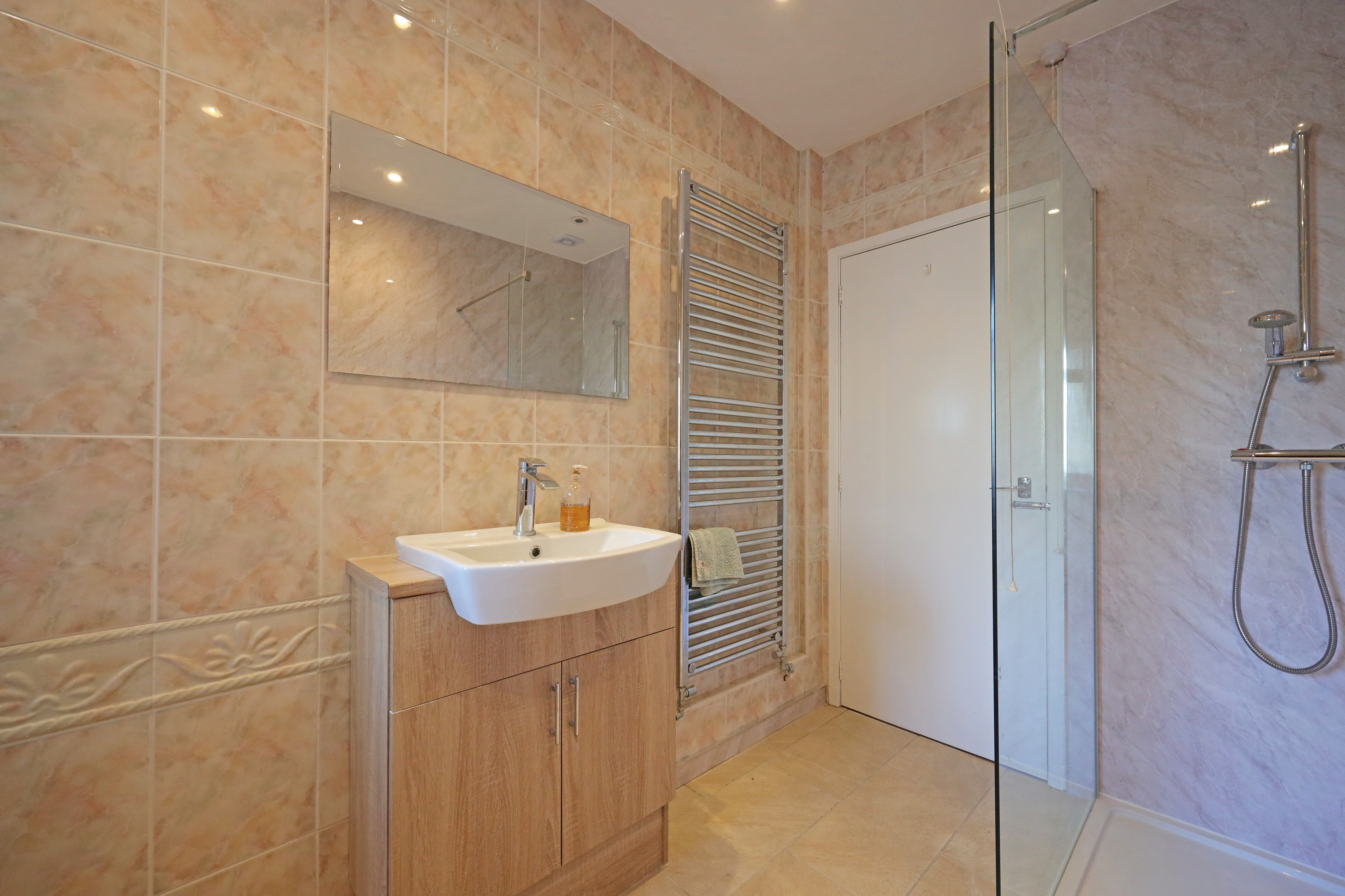 From the inner hallway, there is a spacious tiled shower room with refitted suite comprising; large walk-in shower cubicle with splash screen, enclosed WC and vanity wash basin. There are two double bedrooms on the main ground floor with one bedroom overlooking the rear, with fitted furnishings. The second bedroom looks out onto the front and has further fitted book shelving. An original third bedroom or alternative study also overlooks the front with fitted book shelving and turn staircase leading to the first floor dormer accommodation.