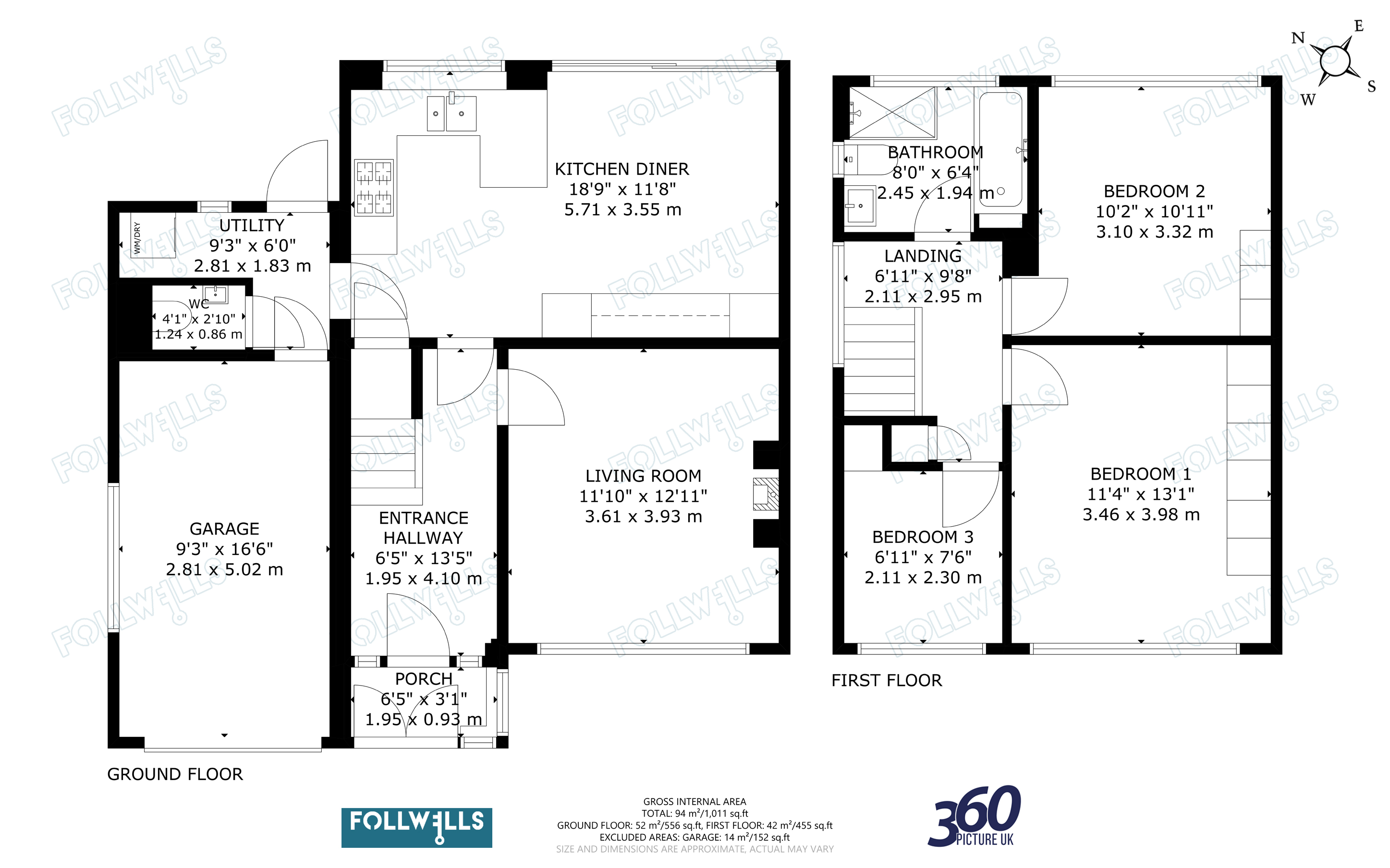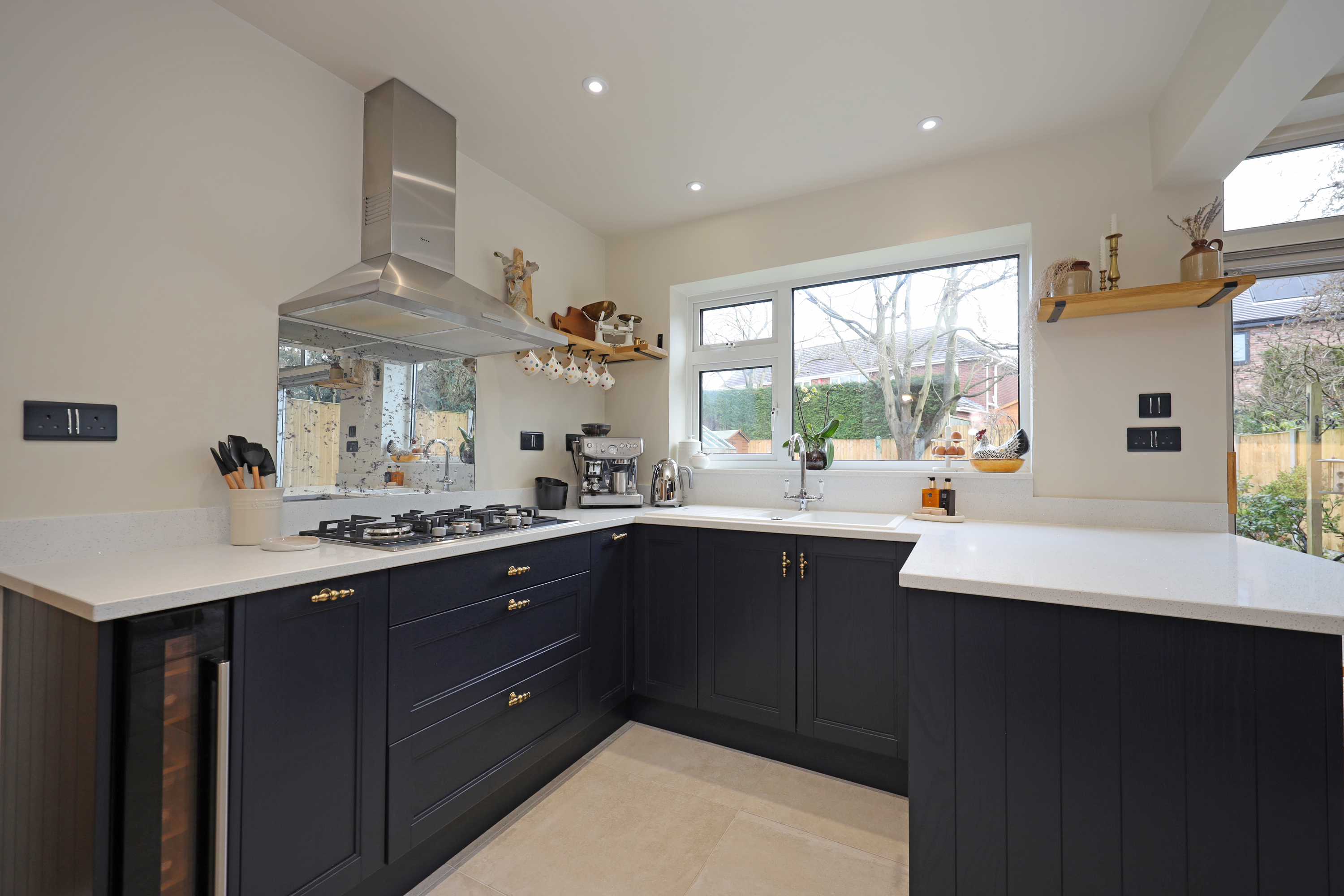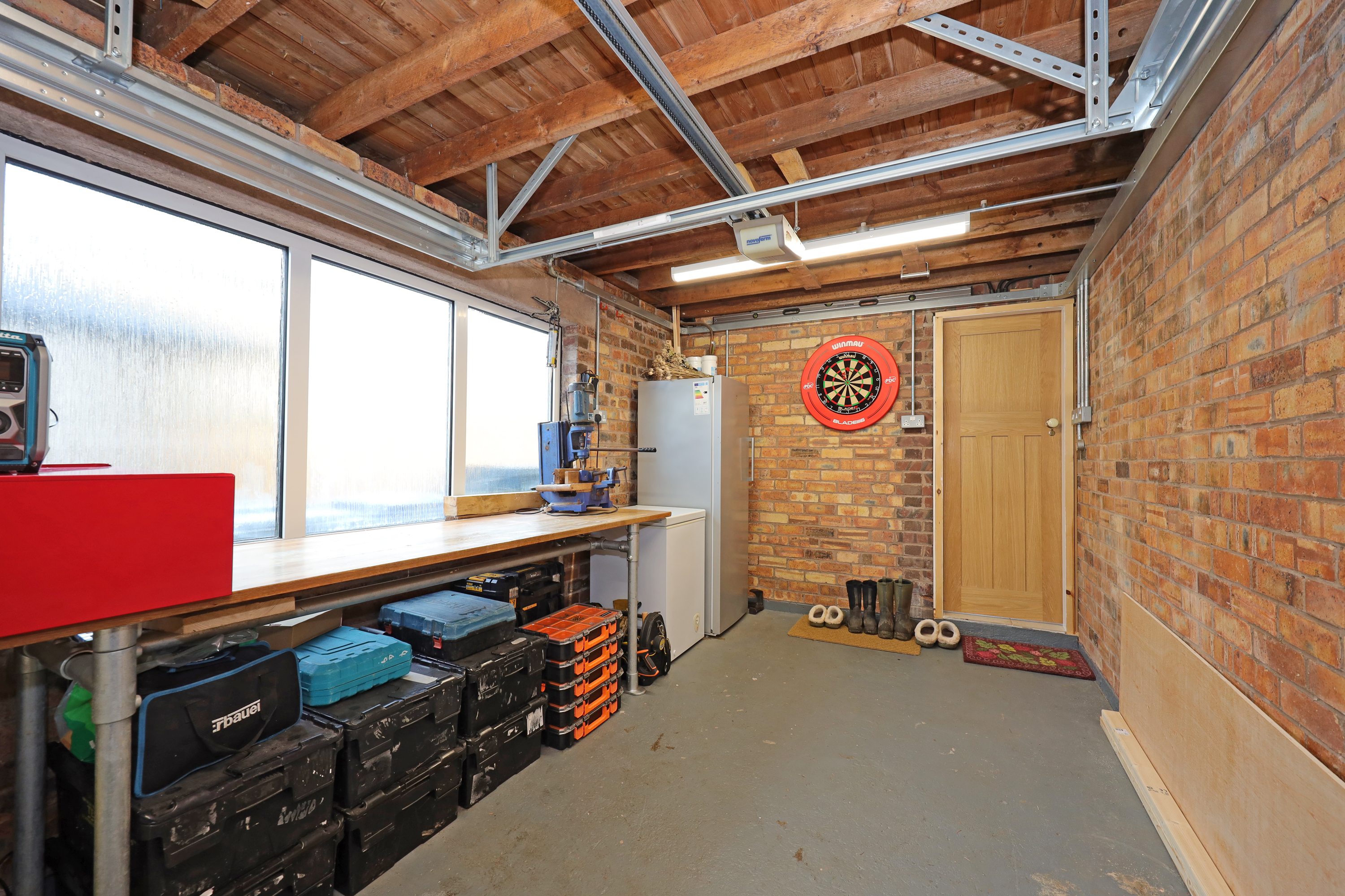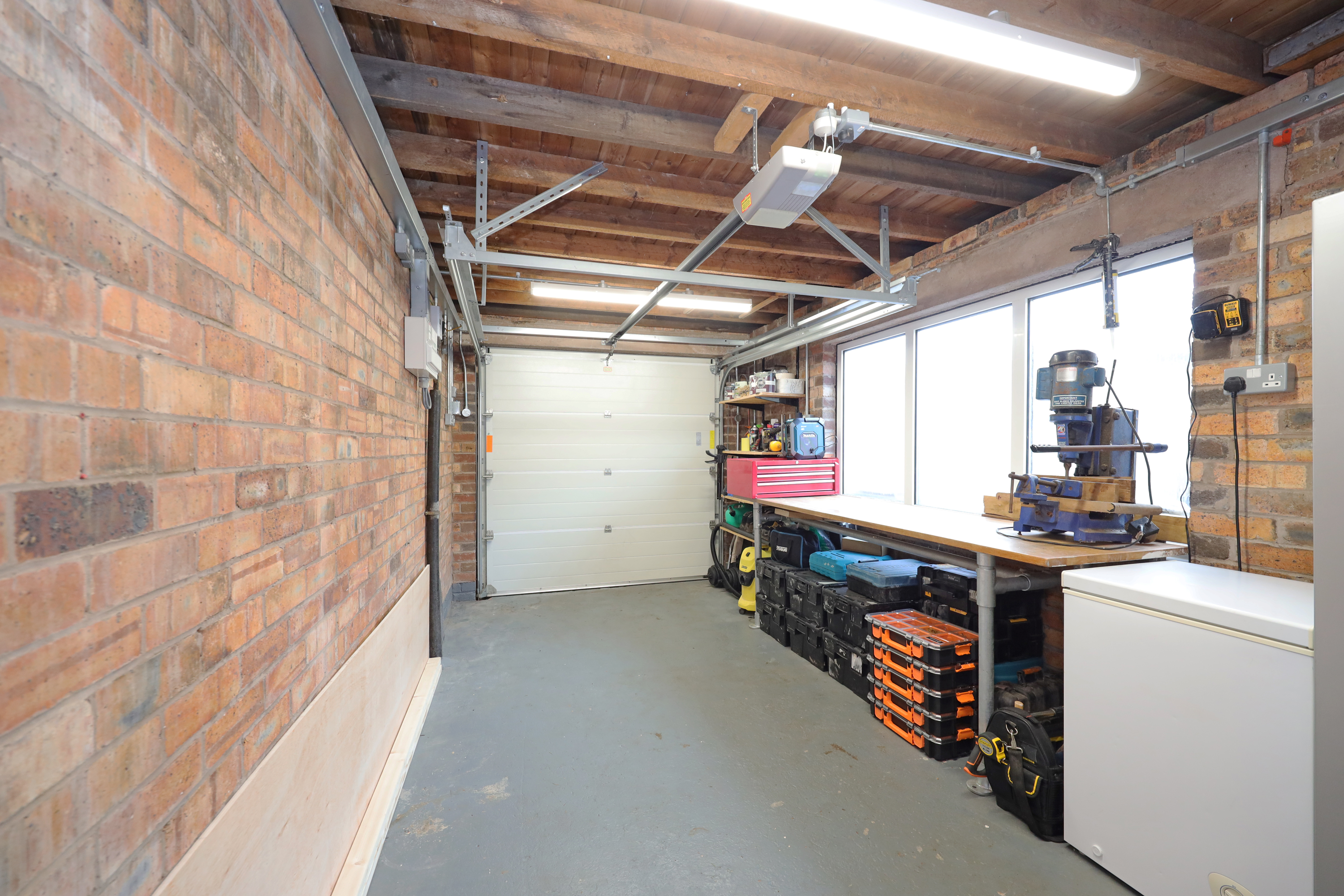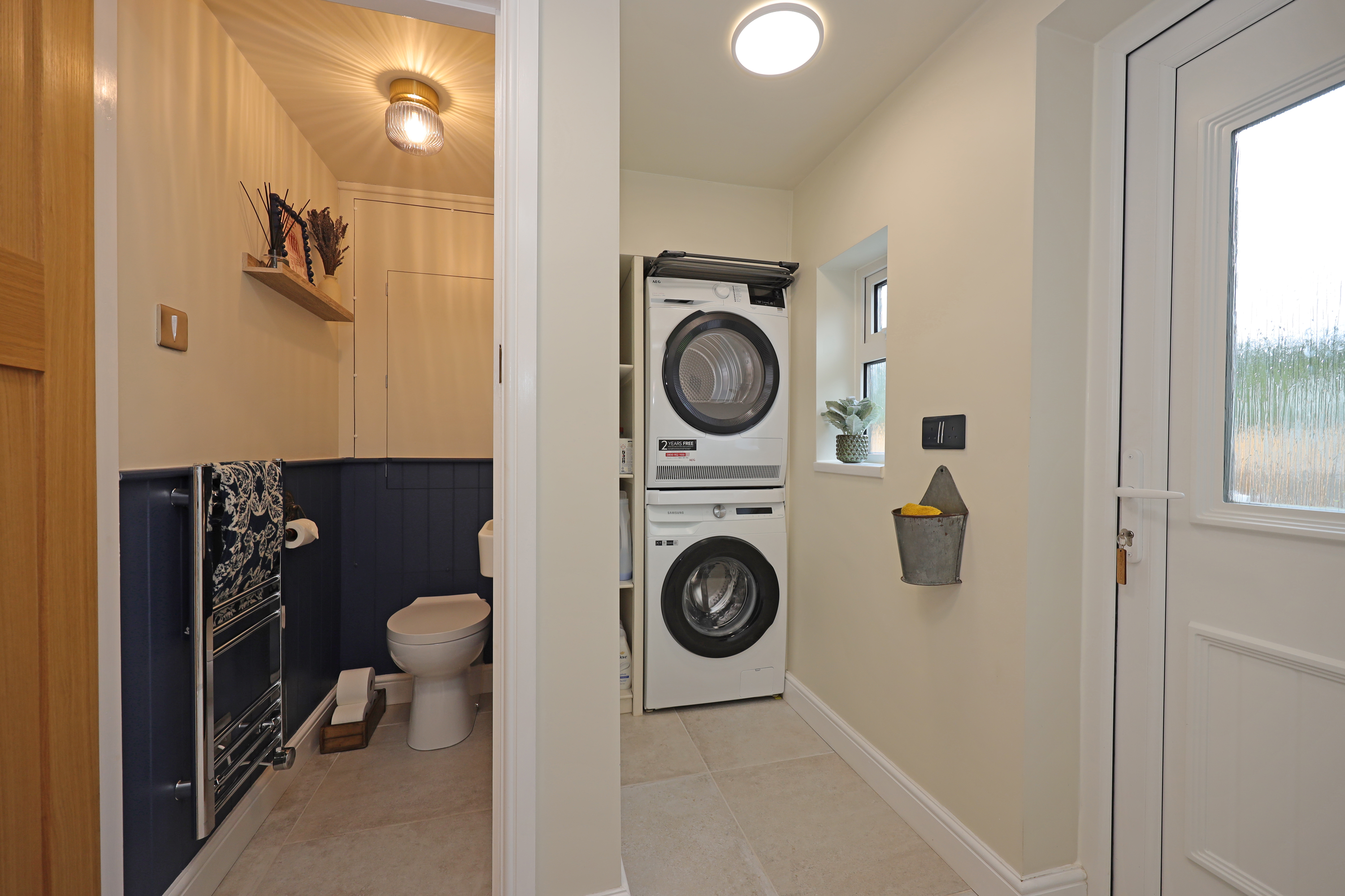 An impressive open plan dining kitchen is fitted with a contemporary range of units having quartz worktops extending to a peninsula breakfast bar area and has a one and a half drainer sink with waste disposal. Integrated appliances comprise; fan assisted electric oven with fitted microwave oven above, dishwasher, full upright fridge, wine chiller and gas hob with extractor canopy. There is ample space for a large dining table with window and a large set of patio doors overlooking and giving access onto the rear garden. The dining kitchen is finished with further feature radiator and additional under stairs storage. Off the kitchen there is a rear utility porch, with continuation of matching tile floor and has provision for washing facilities. Within the rear porch there is also an enclosed cloakroom with WC, wash basin and concealed access to the central heating boiler. The rear utility porch also provides rear external access and internal access to the attached garage, which has further window, power connection and an automatic main roller door. The property has also been pre-wired, allowing straight forward installation of an electric vehicle charging point.