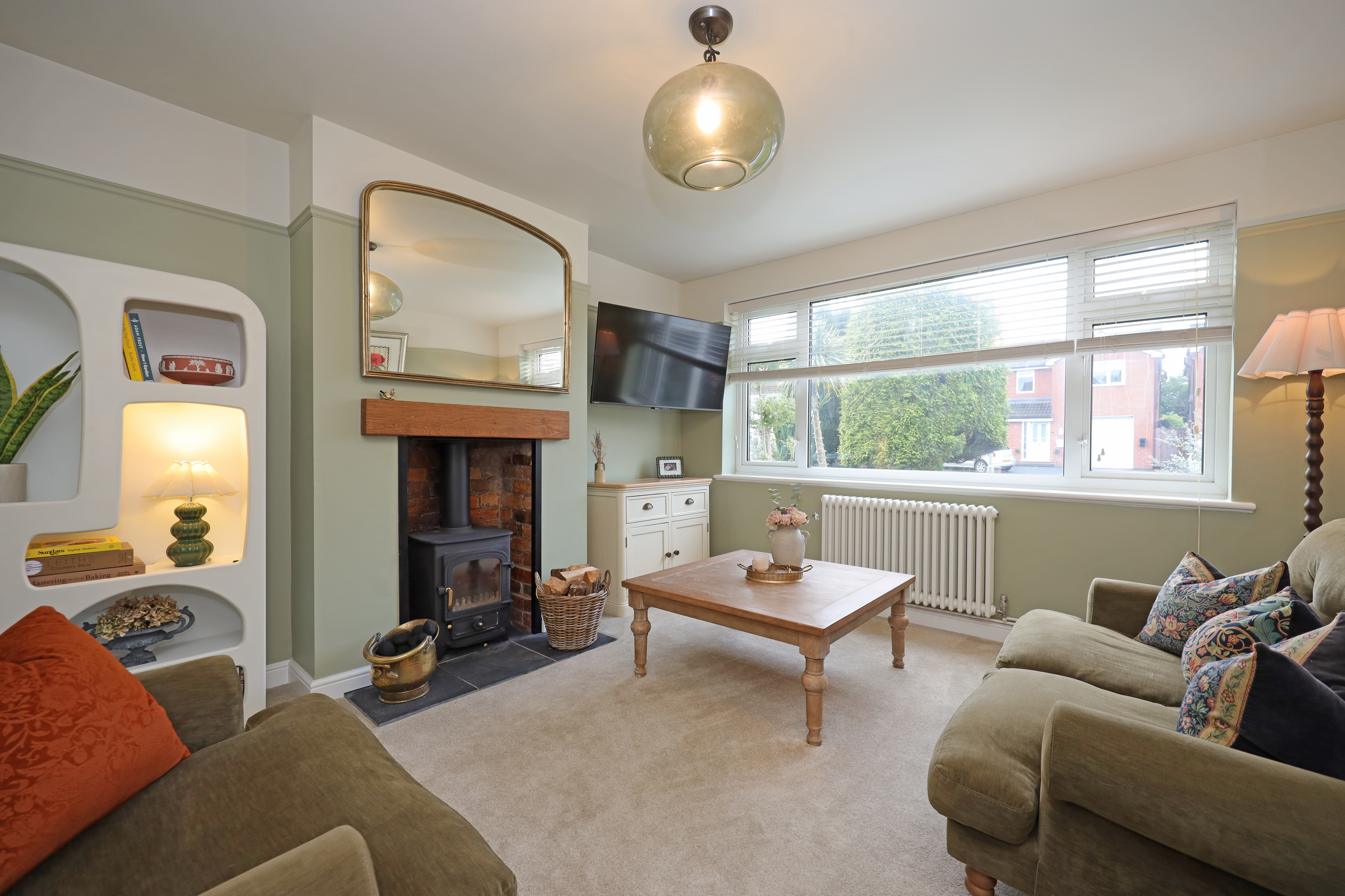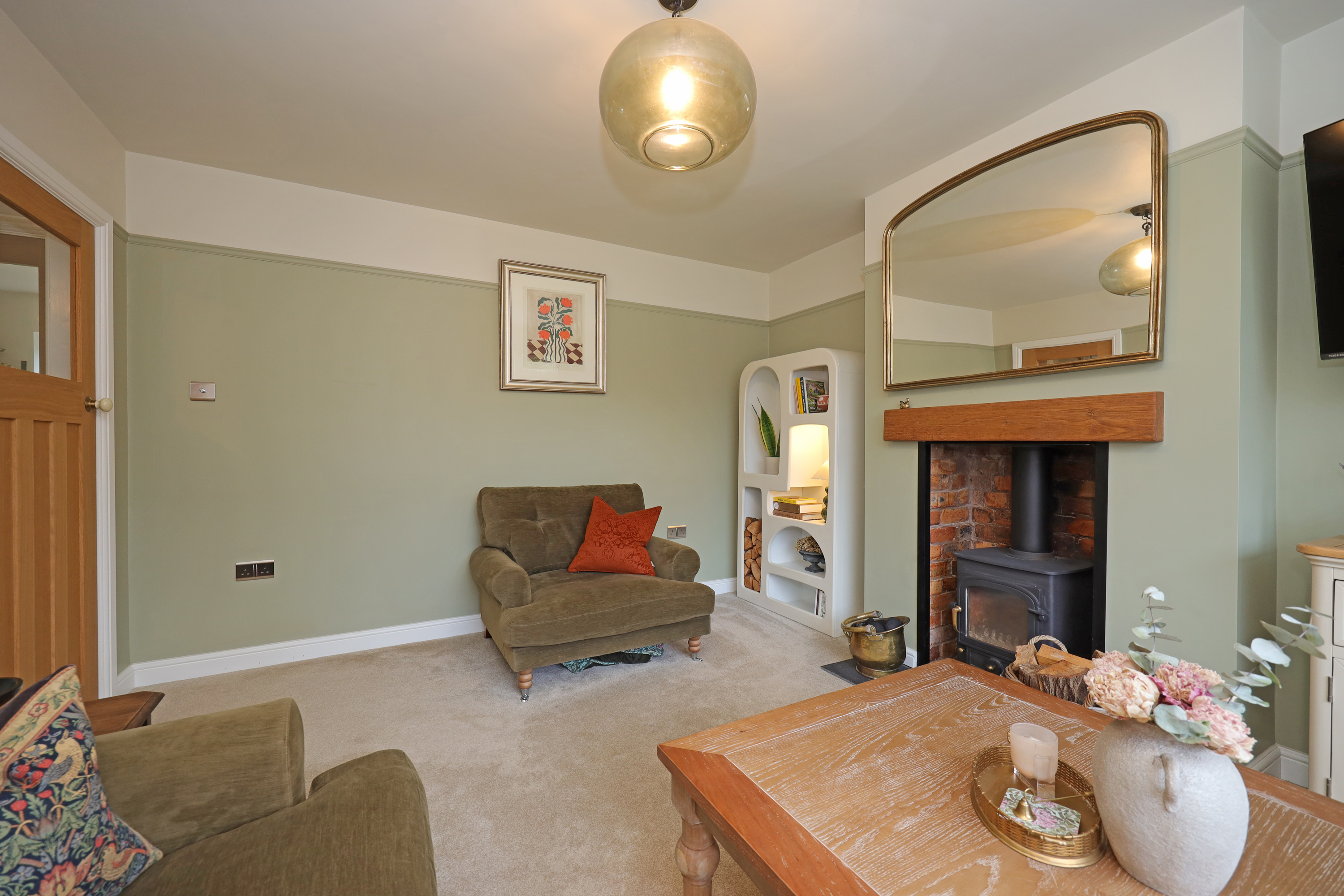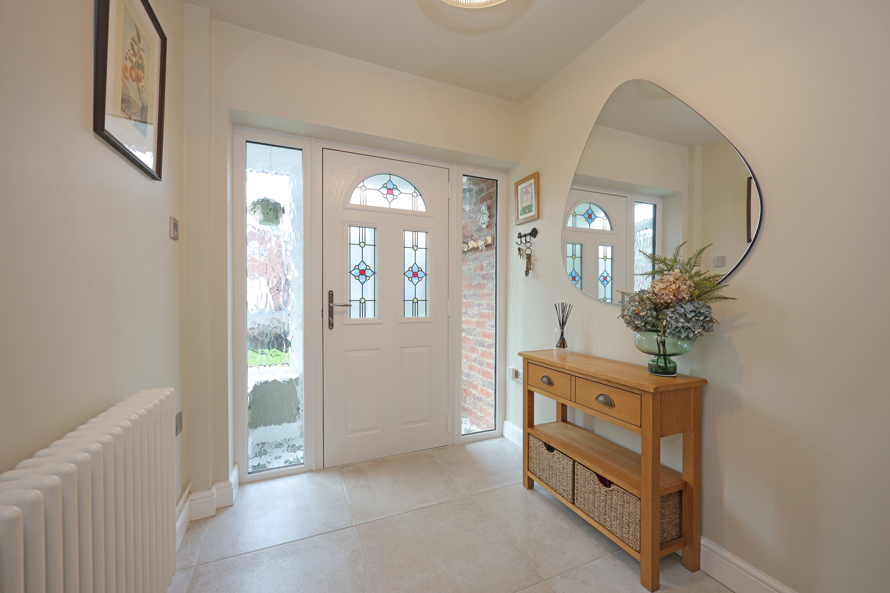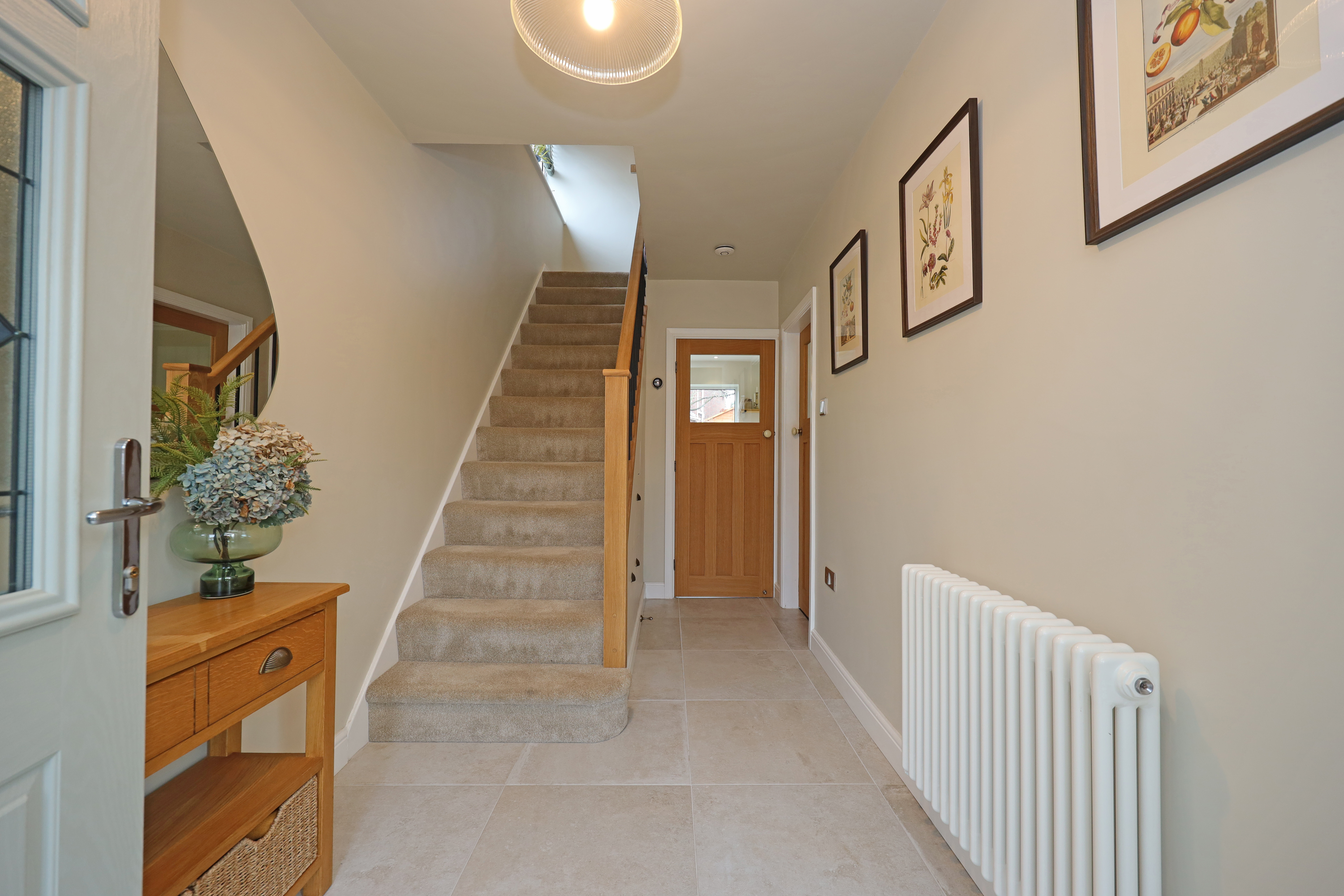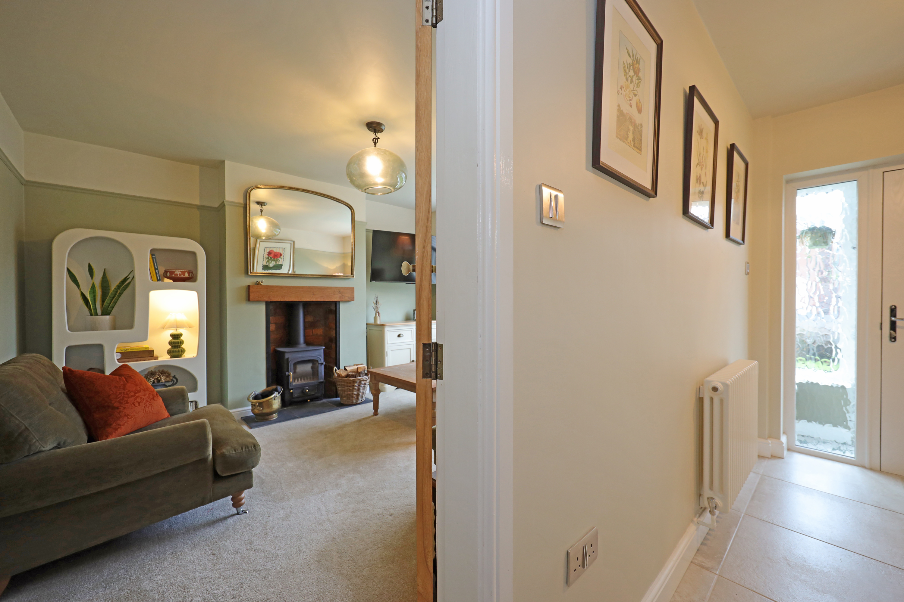 Enclosed glazed porch opening to hallway with part glazed oak internal doors and large format tile flooring continuing through to the dining kitchen. The hall features a traditional style radiator and replacement oak balustrade staircase with fitted shoe/store cupboards underneath. A beautifully appointed living room enjoys a large picture window overlooking the front and has further feature radiator and a clear view multi fuel stove set within the chimney breast with oak over mantle.