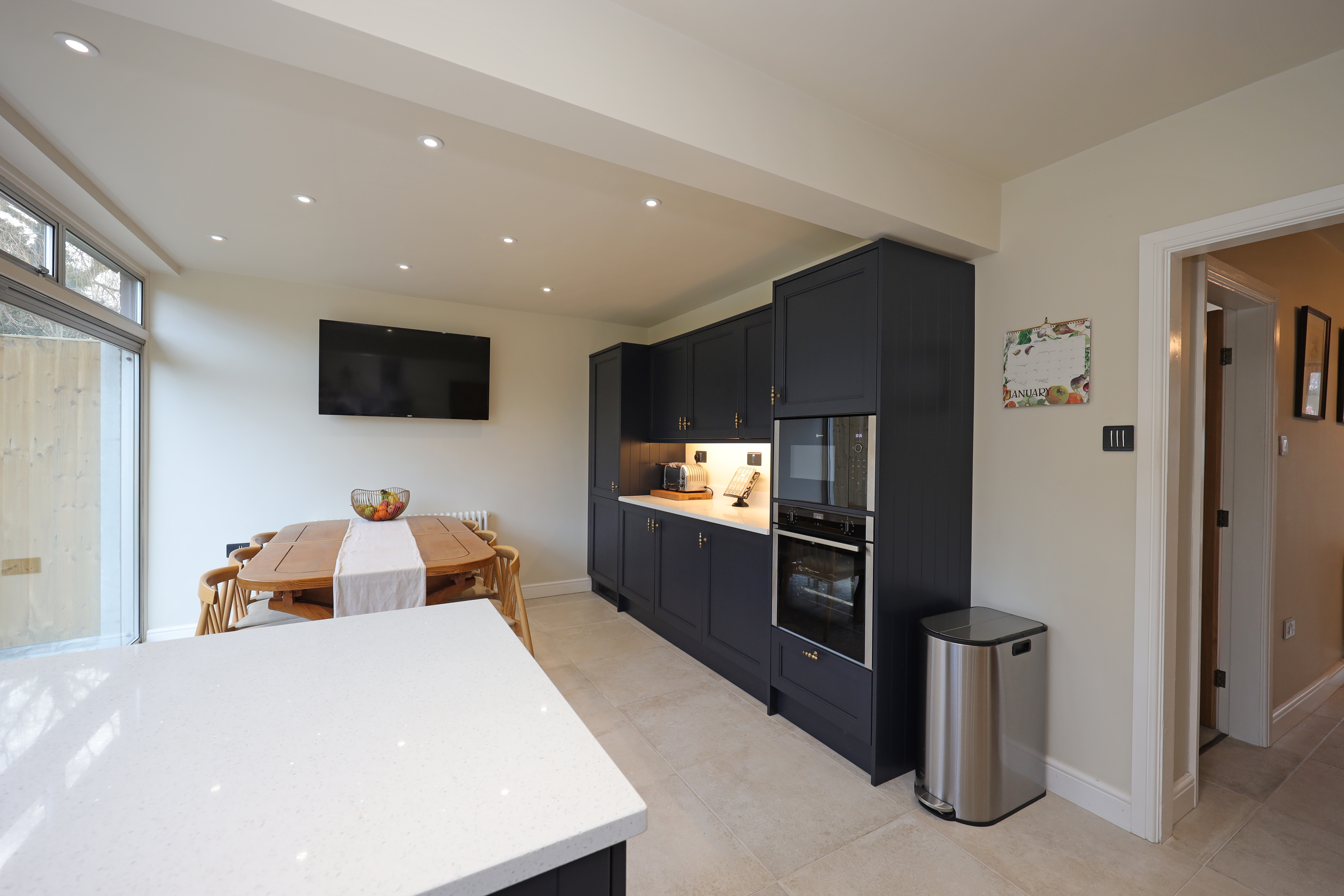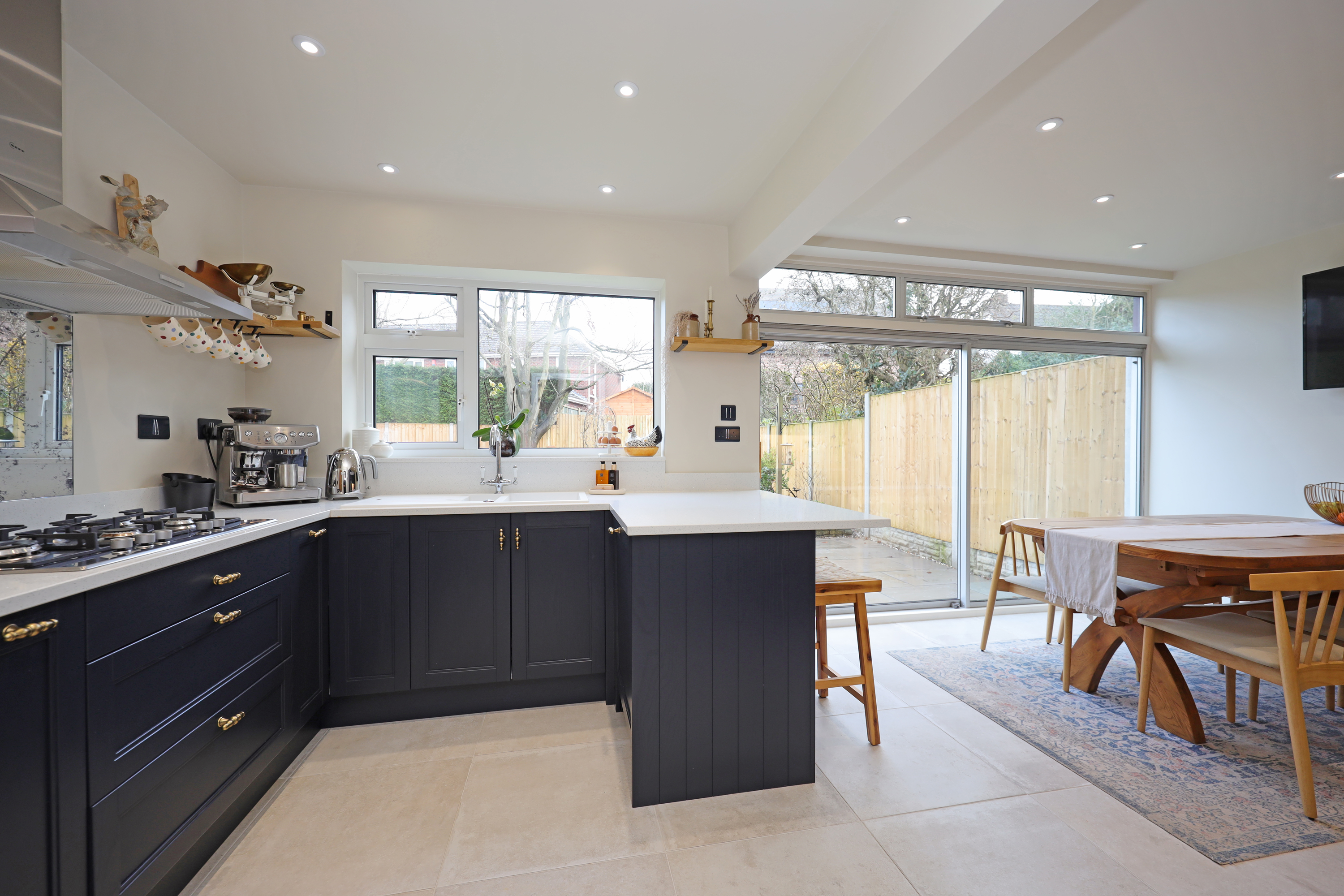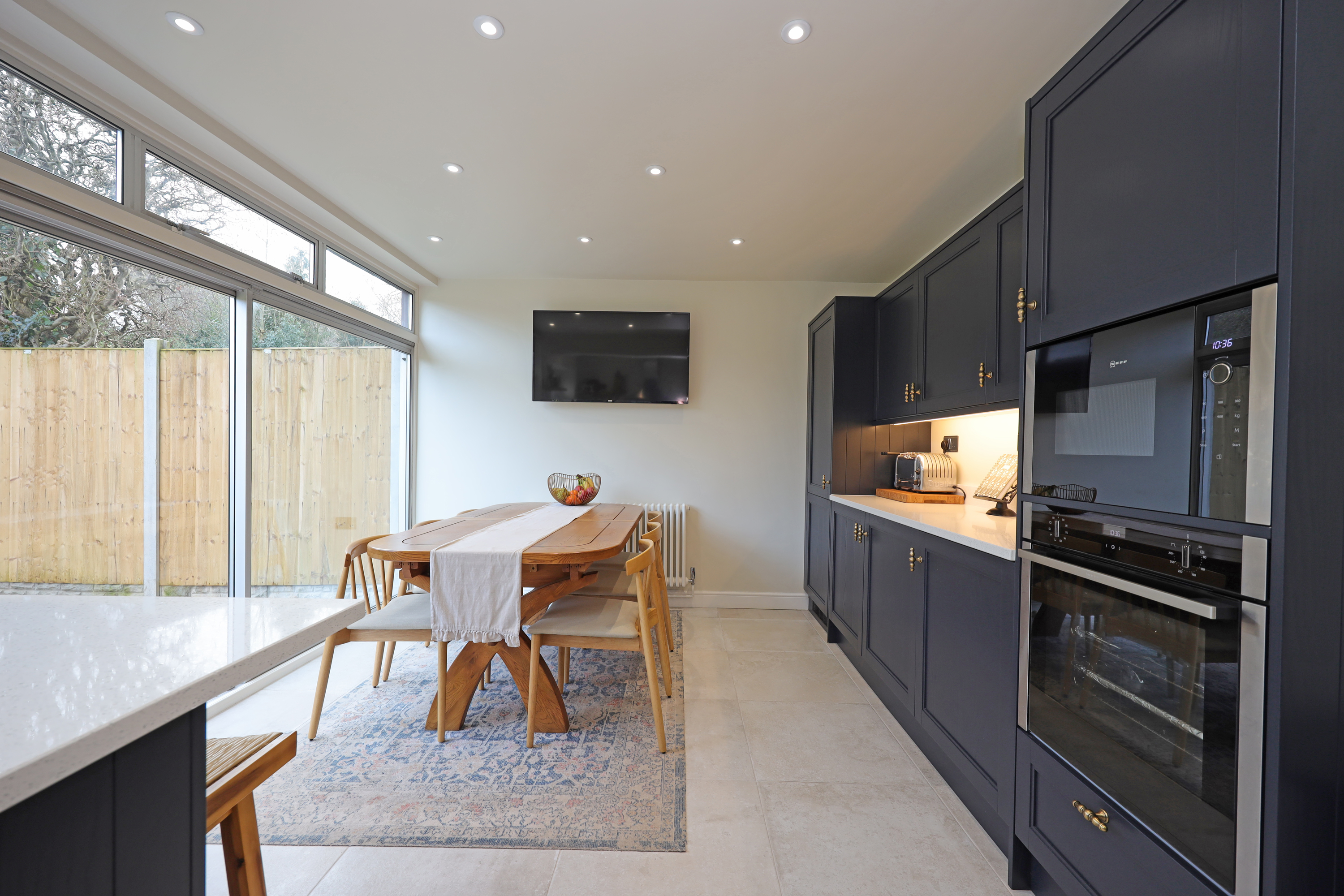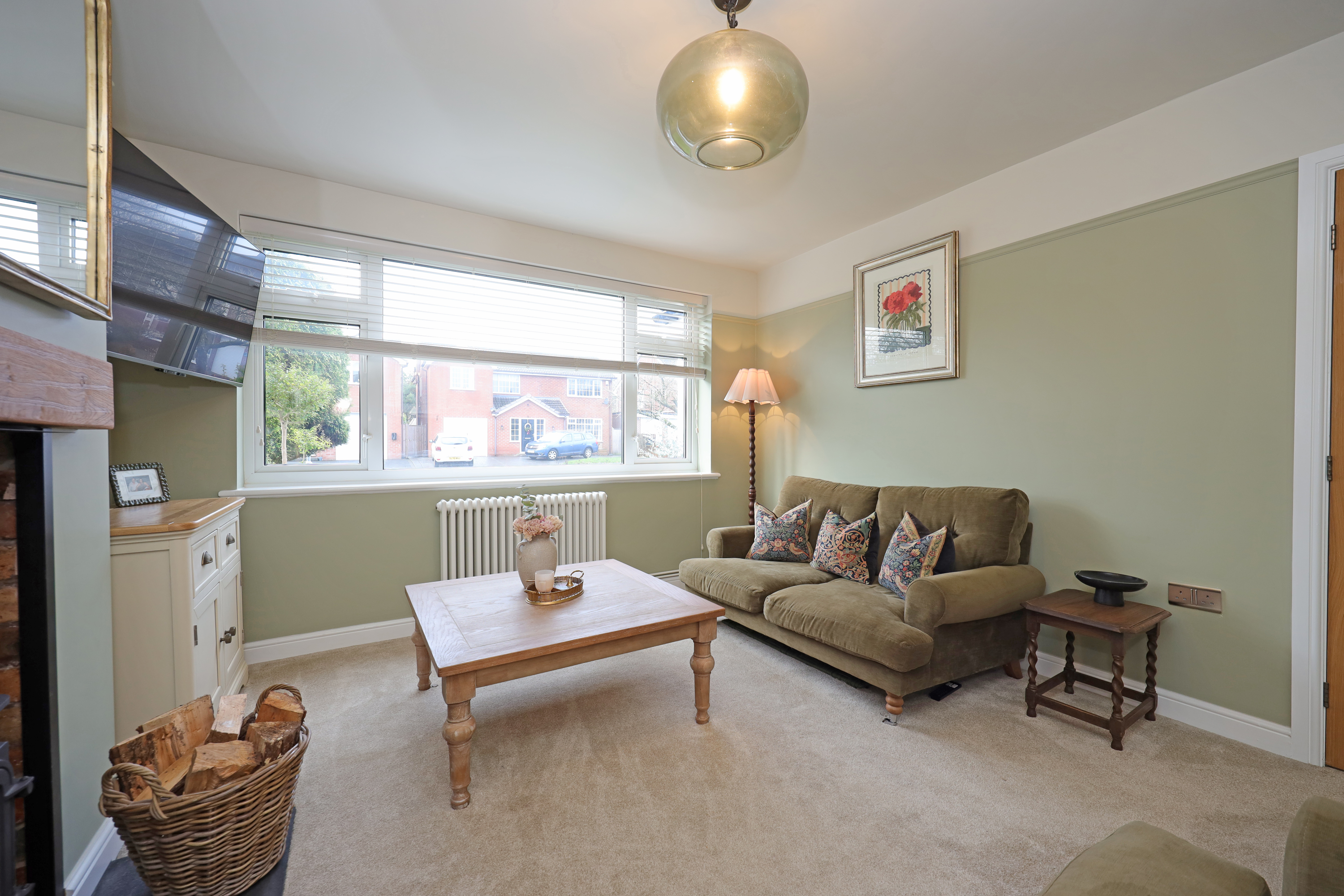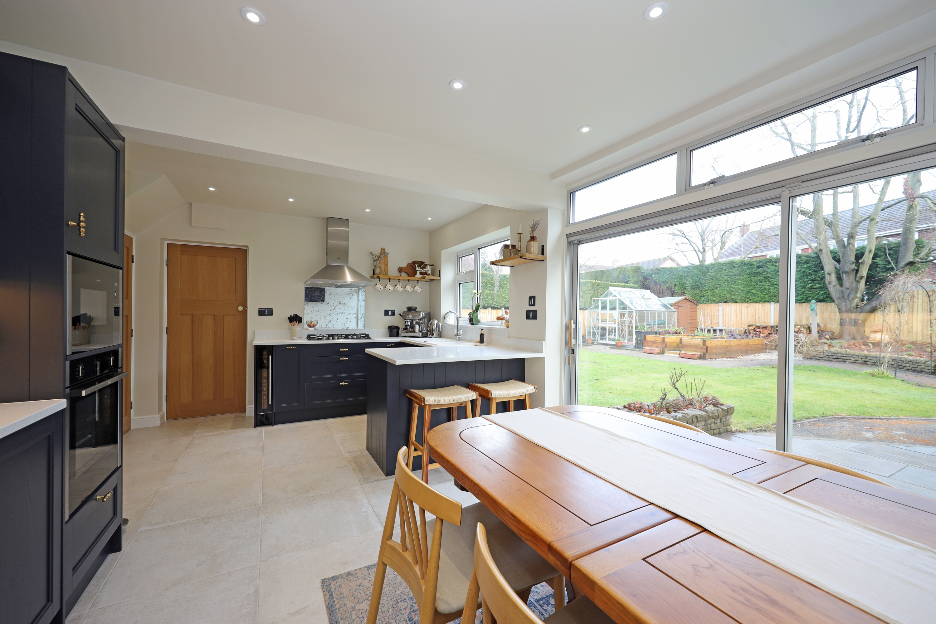Enclosed glazed porch opening to hallway with part glazed oak internal doors and large format tile flooring continuing through to the dining kitchen. The hall features a traditional style radiator and replacement oak balustrade staircase with fitted shoe/store cupboards underneath. A beautifully appointed living room enjoys a large picture window overlooking the front and has further feature radiator and a clear view multi fuel stove set within the chimney breast with oak over mantle.