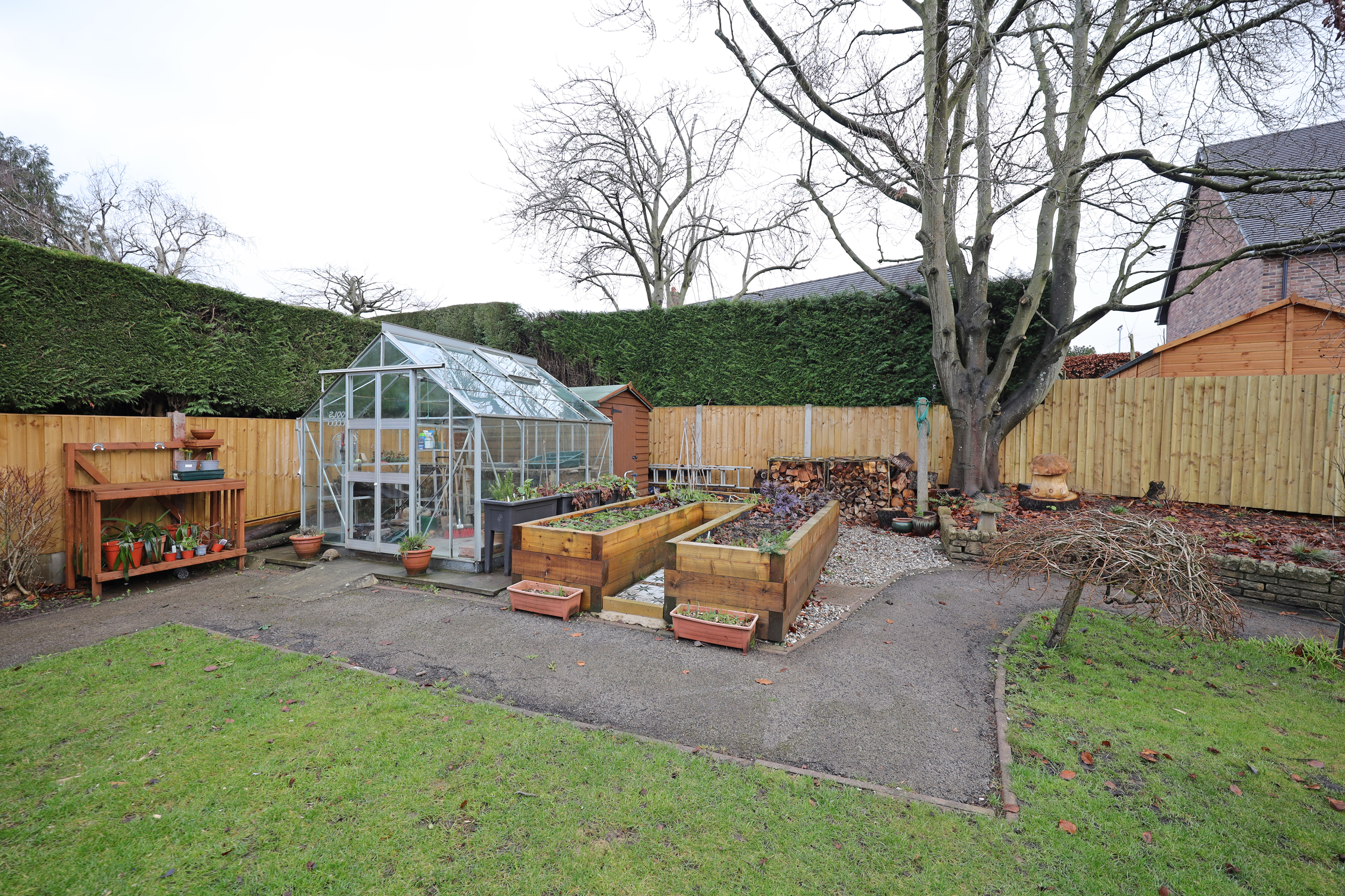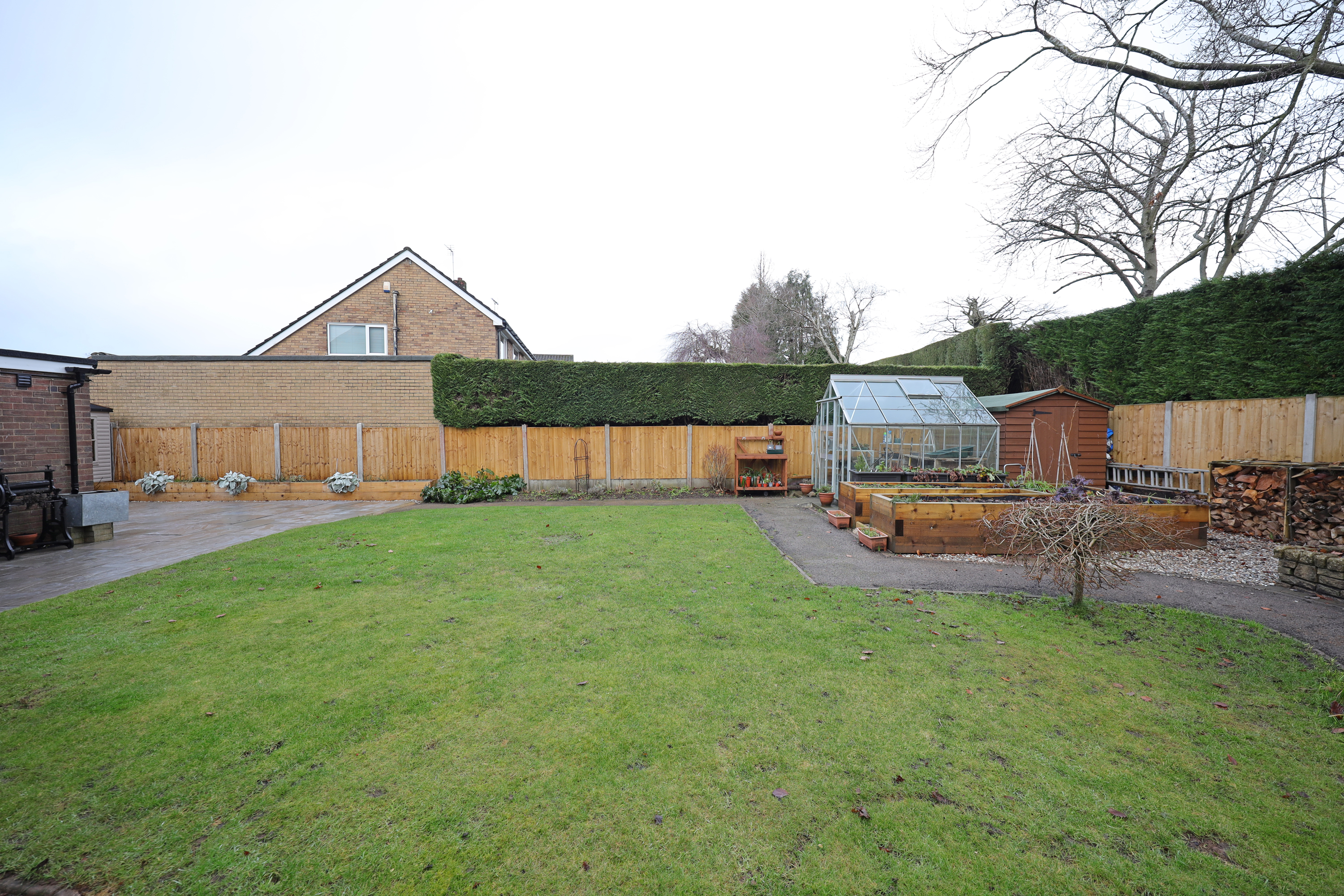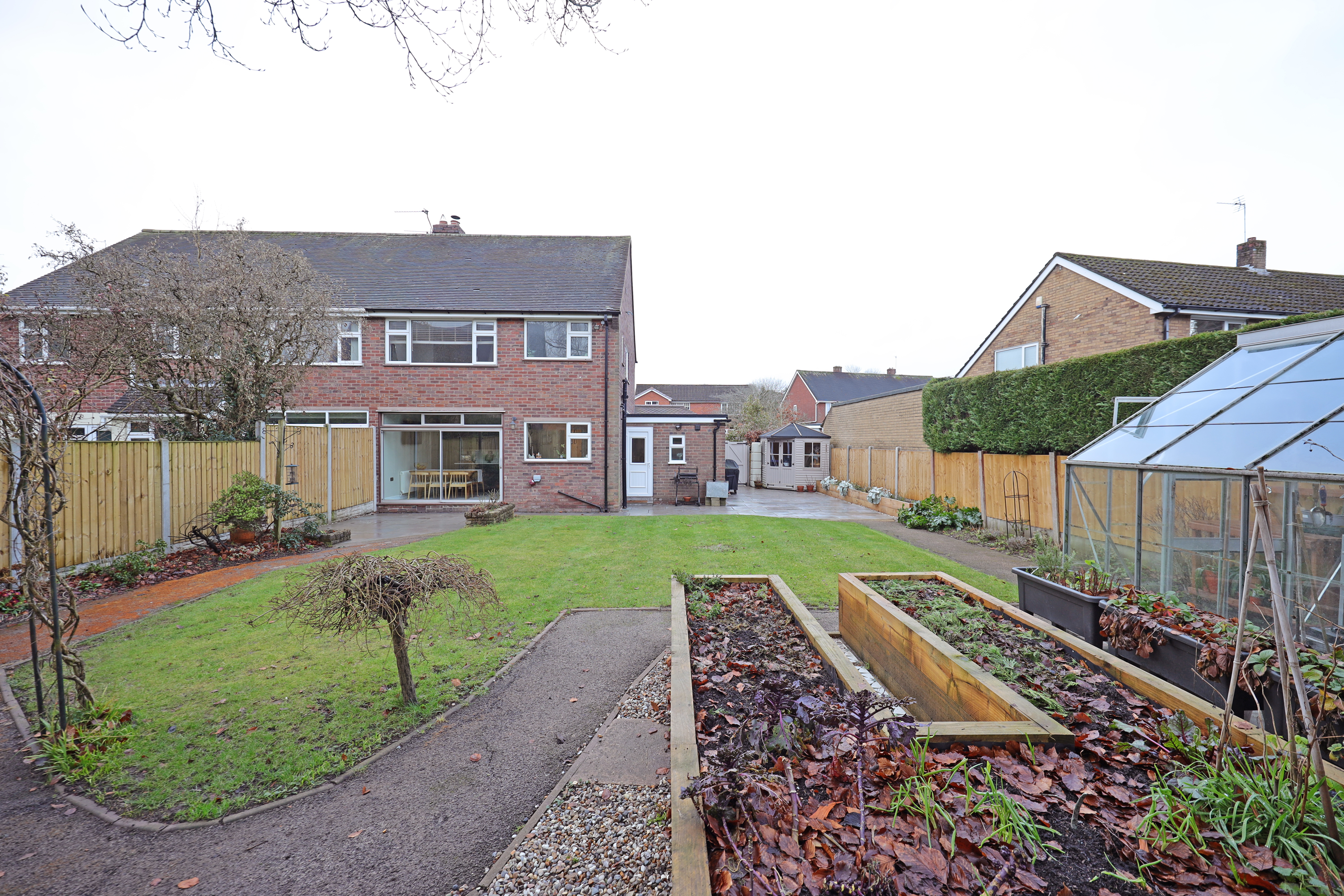 The property stands on a generous plot with one and a half width frontage, offering tremendous potential for further side extension in the future (STPP). Currently there is a driveway leading to the garage with shrub screening to boundaries and a lawn area. The rear garden has been extensively landscape comprising of a large Indian stone patio area to the rear and side of the property creating potential for further hard standing parking if required. There is an attractive fully enclosed rear garden with shaped lawn and pathways having various borders and a raised timber sleeper vegetable plot. Outbuildings comprise timber summerhouse, shed and greenhouse.