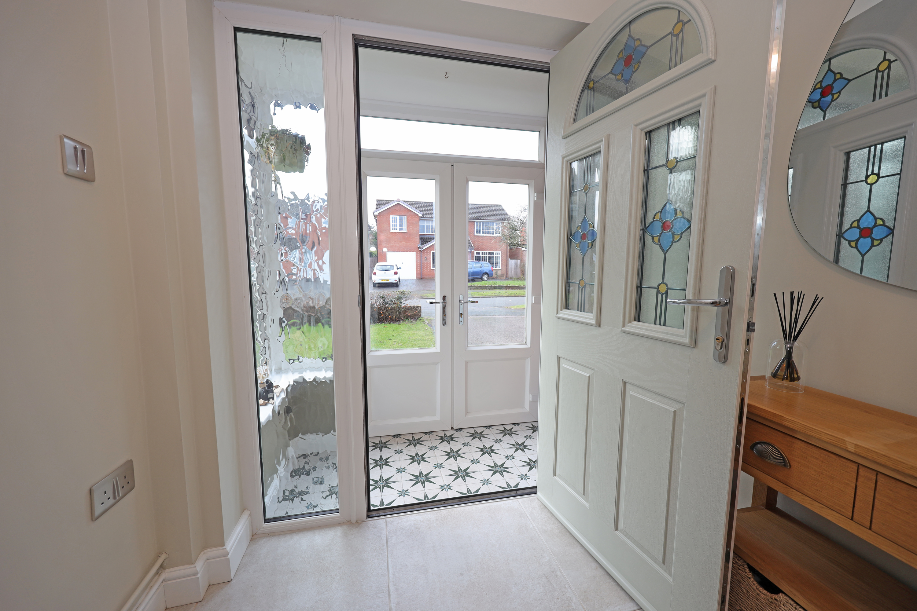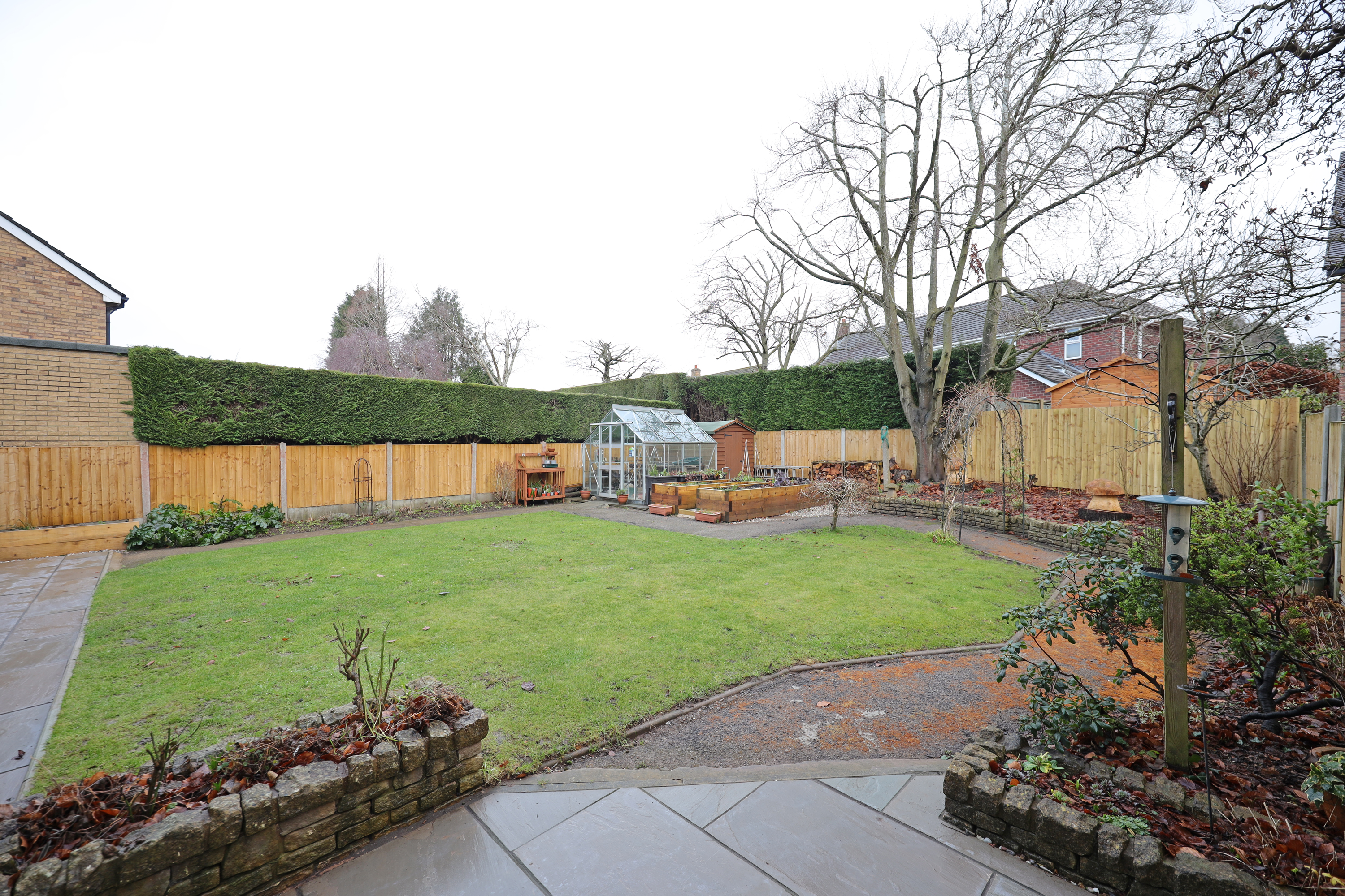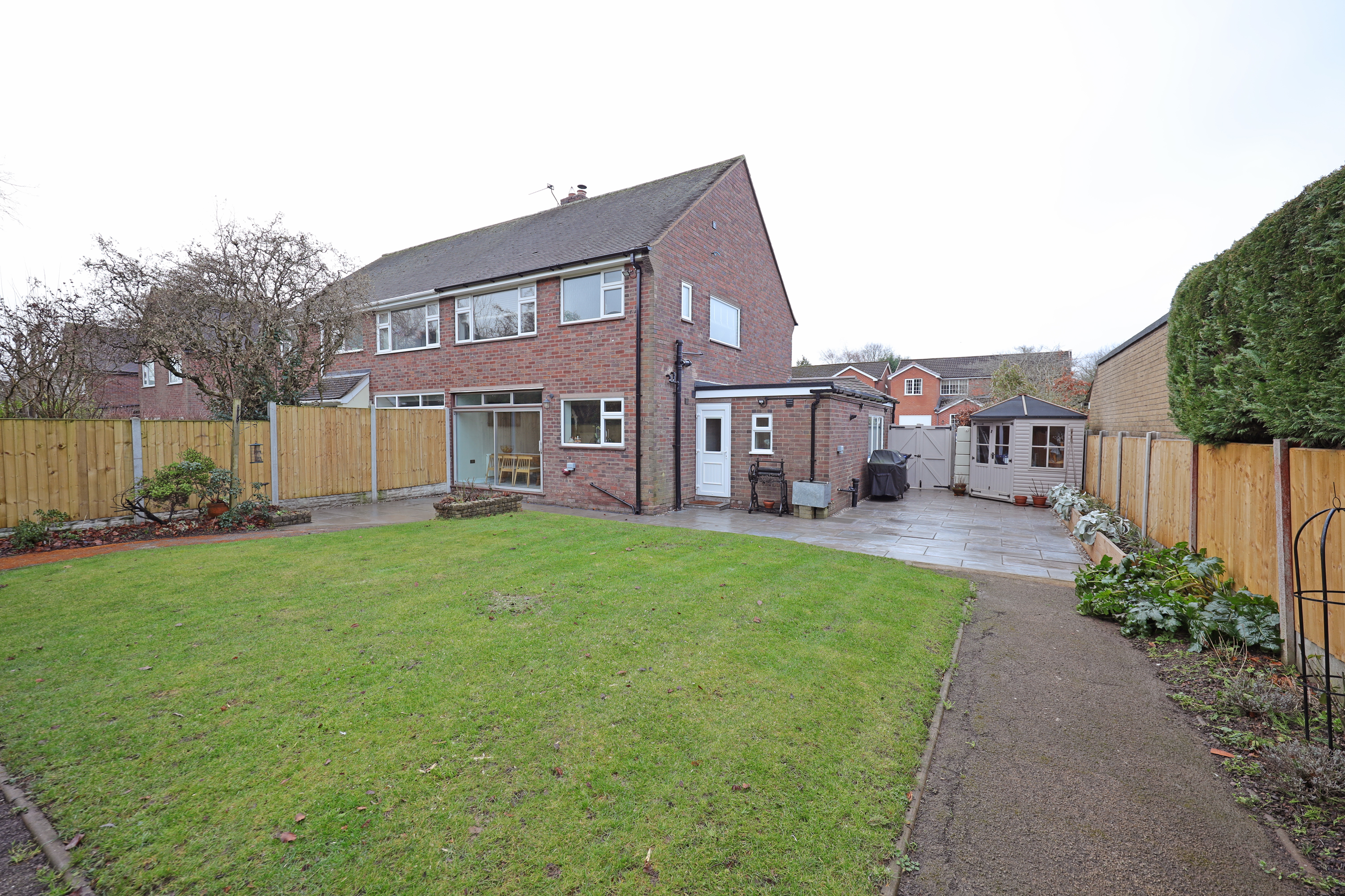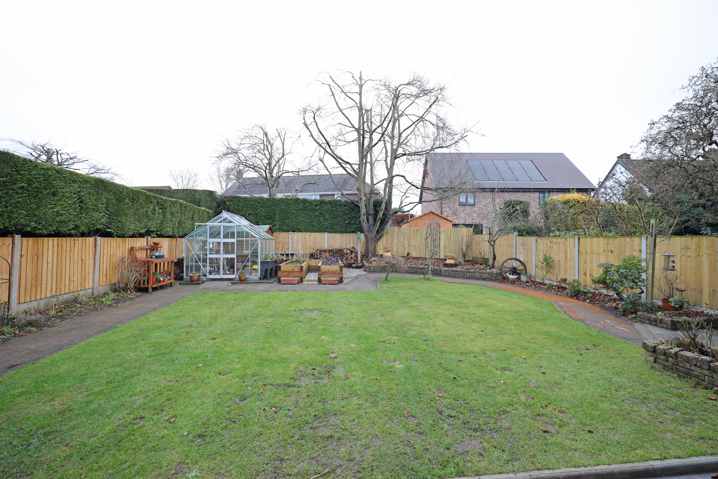 The property stands on a generous plot with one and a half width frontage, offering tremendous potential for further side extension in the future (STPP). Currently there is a driveway leading to the garage with shrub screening to boundaries and a lawn area. The rear garden has been extensively landscape comprising of a large Indian stone patio area to the rear and side of the property creating potential for further hard standing parking if required. There is an attractive fully enclosed rear garden with shaped lawn and pathways having various borders and a raised timber sleeper vegetable plot. Outbuildings comprise timber summerhouse, shed and greenhouse.