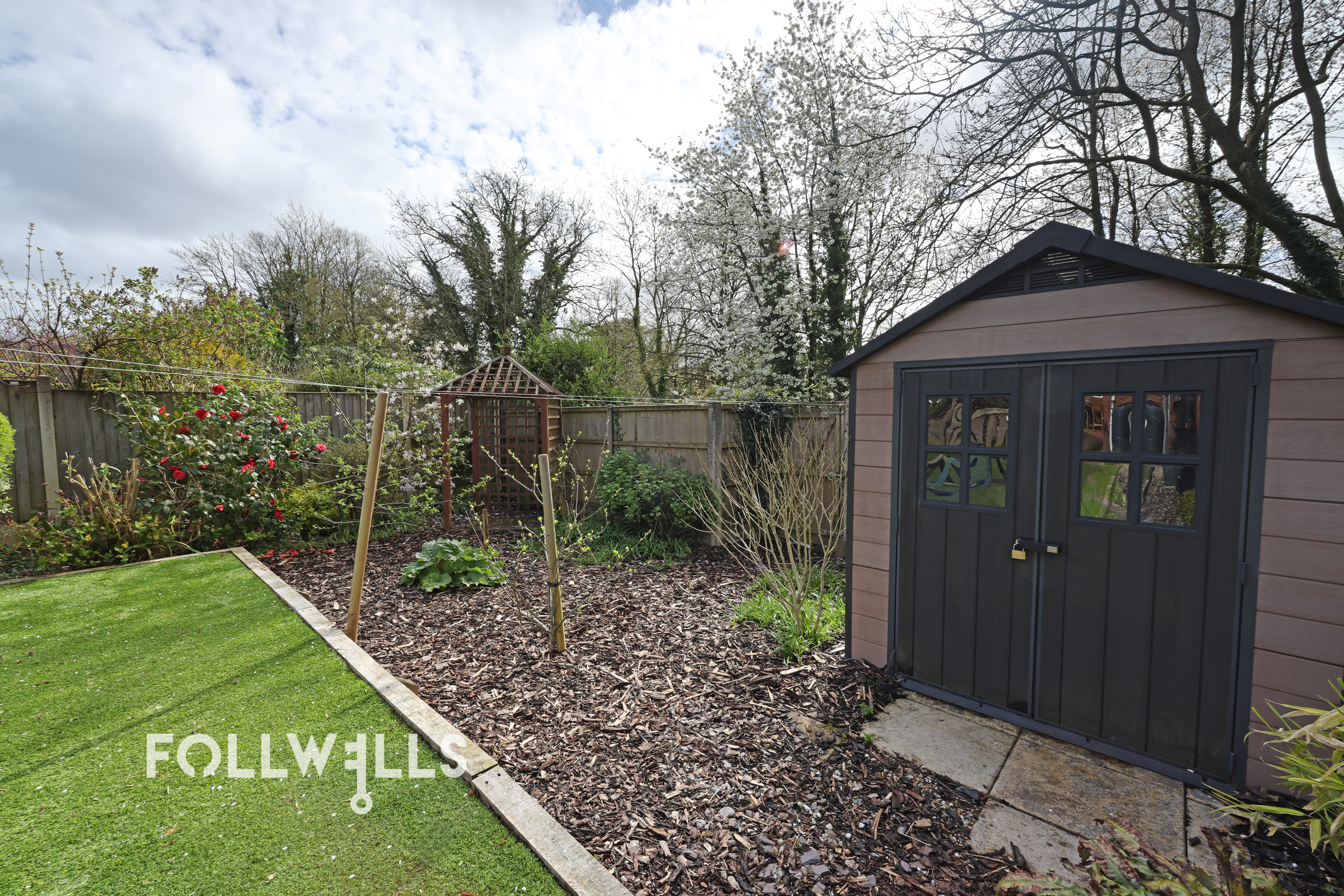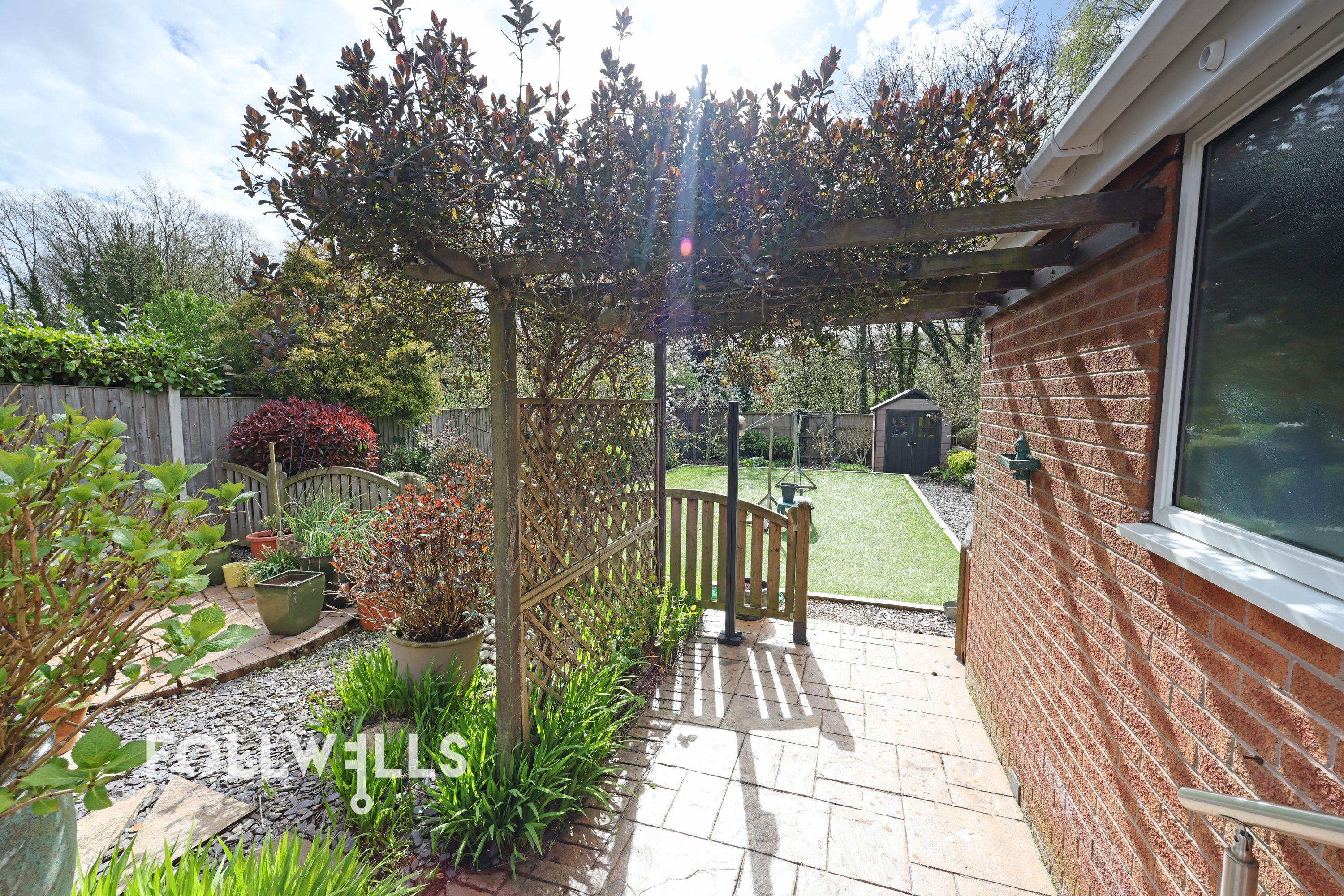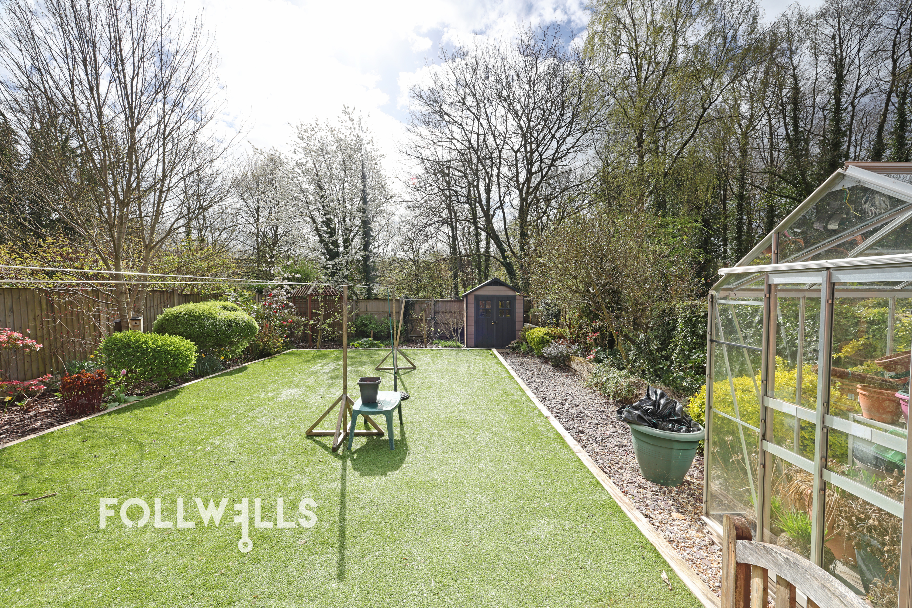 The rear garden provides a large moulded concrete sitting area adjacent to the house with steps down under a timber pergola to a flat area of artificial lawn surrounded by well stocked shrub beds, garden shed and greenhouse.