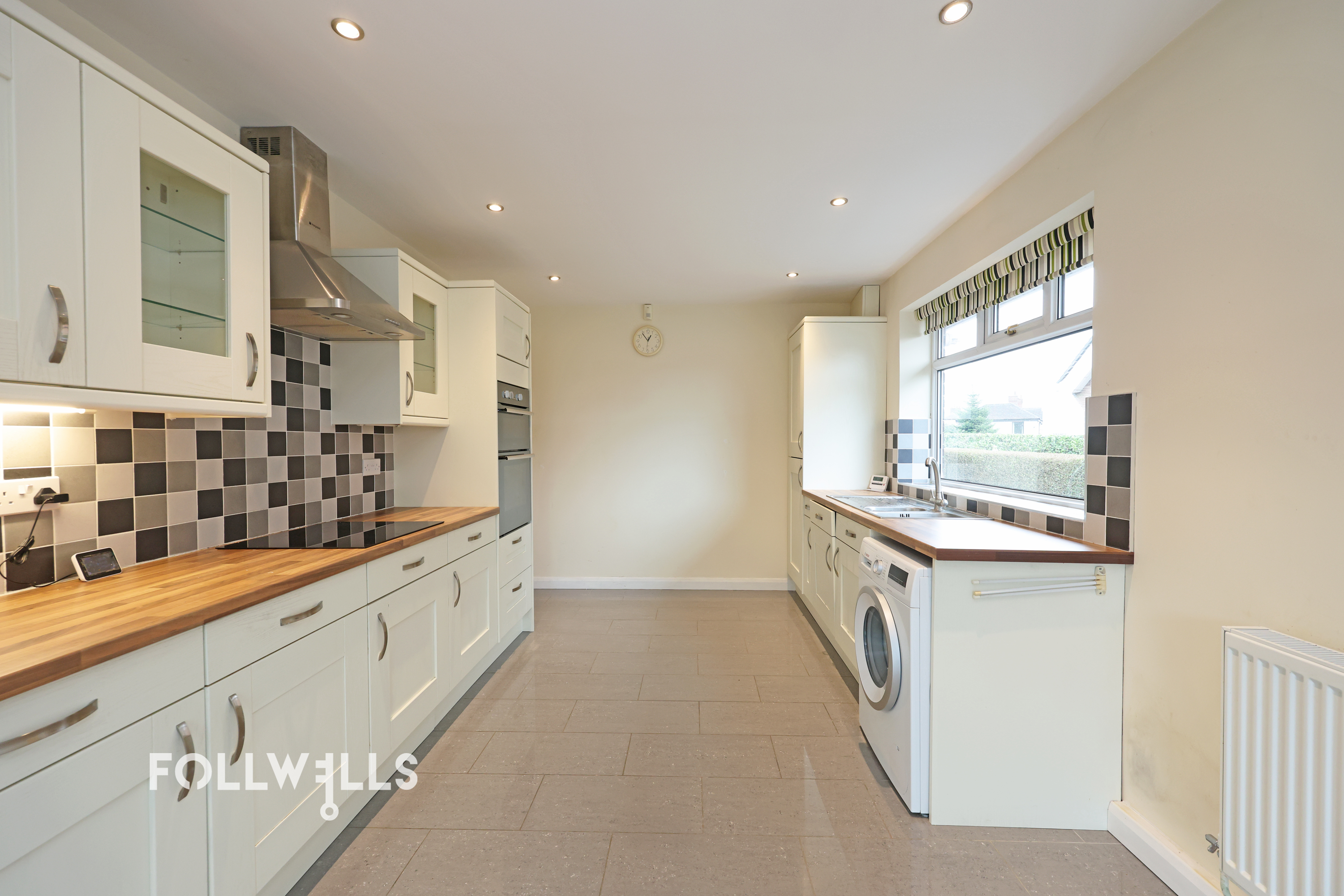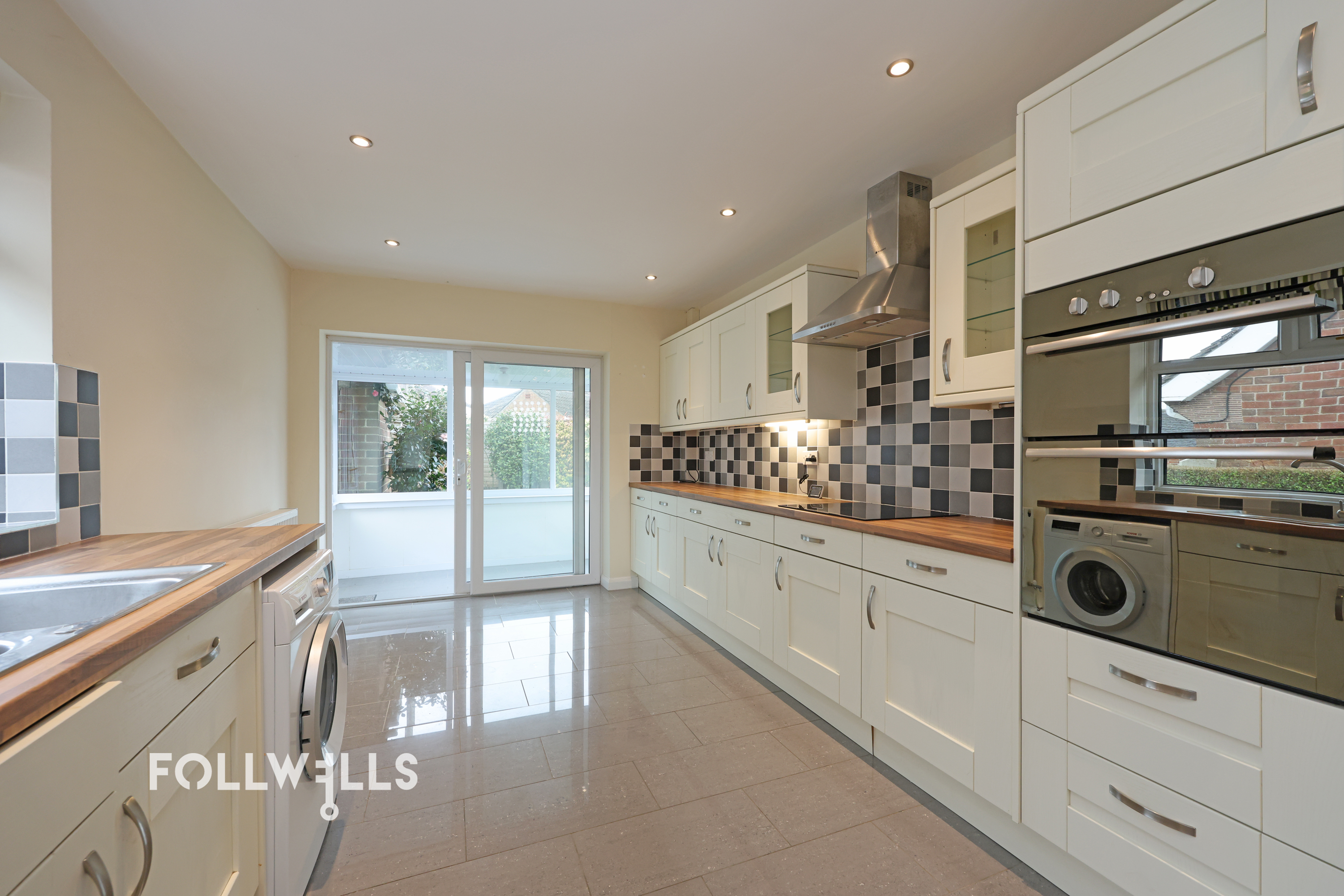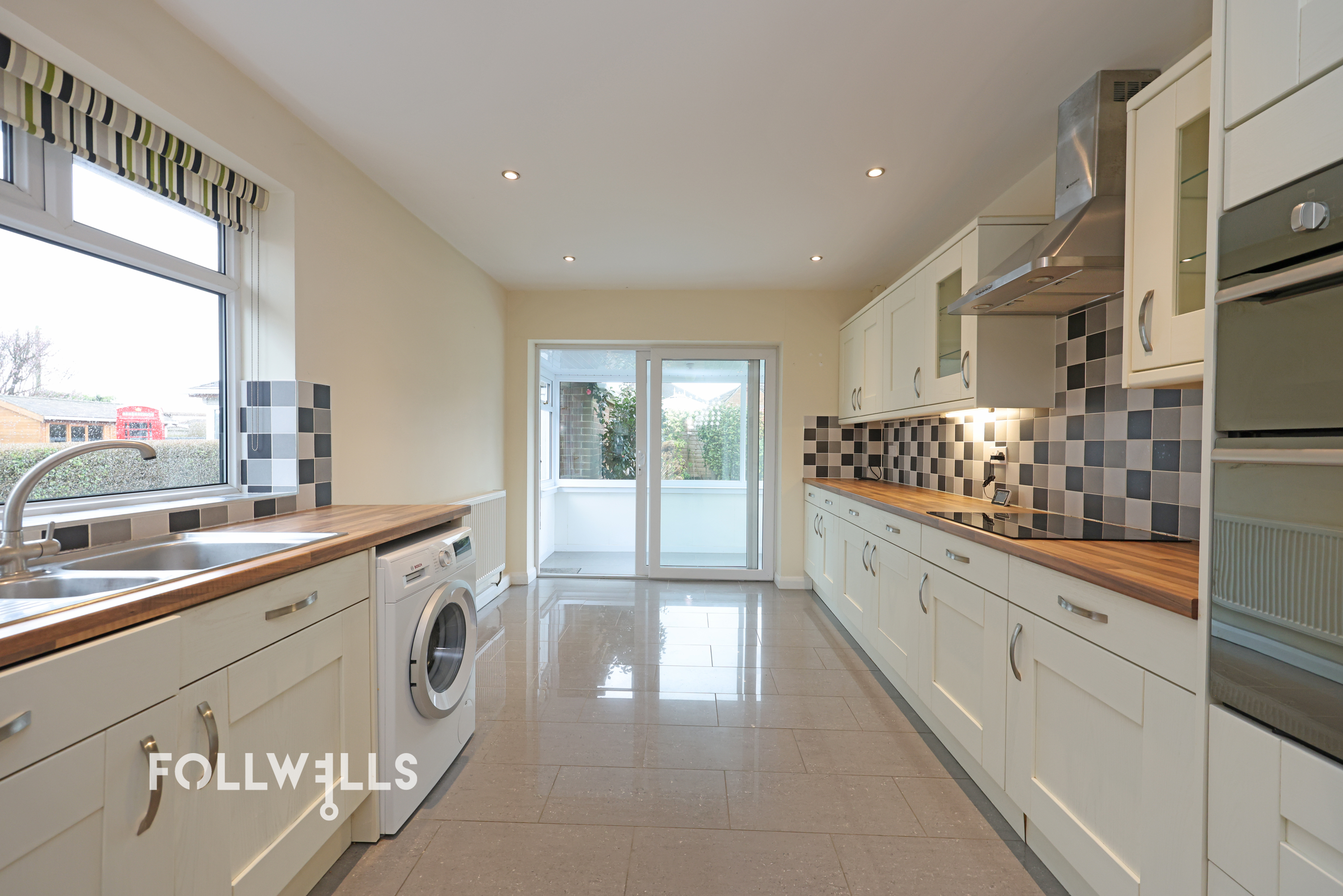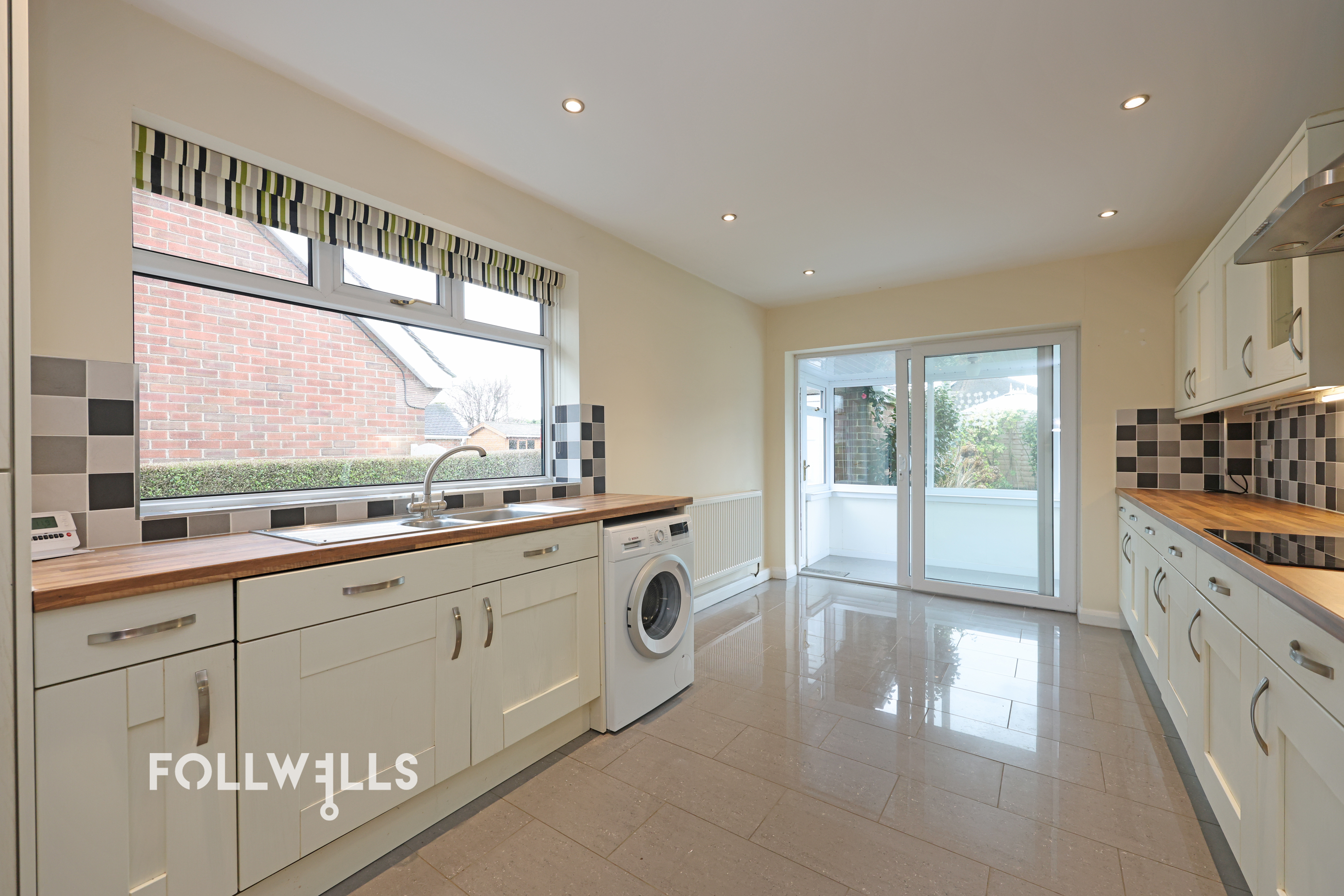 An equally spacious breakfast/dining kitchen is well fitted with a range of units and appliances comprising, integrated fridge and separate freezer, fan assisted electric grill oven, and induction hob with extractor. A larder cupboard houses a combination central heating boiler. Patio sliding doors open to an attached UPVC glaze sun lounge with brick base, having dual external access to both the rear garden and side driveway.